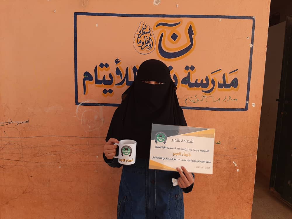ابنتنا شيماء العبدو من قرية الشام للايتام في سرمدا تم تكريمها في مدرسة نور الدين لتفوقها في مذاكرات الشهادة الإعدادية على قريناتها .