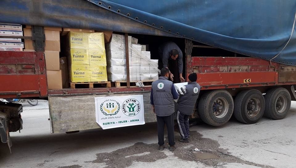 توزيع سلل غذائية والبسة وفوط وحليب أطفال على اهلنا المهجرين من الغوطة الشرقية والذين وصلوا لاريحا بدعم وقف دار الايتام باستنبول