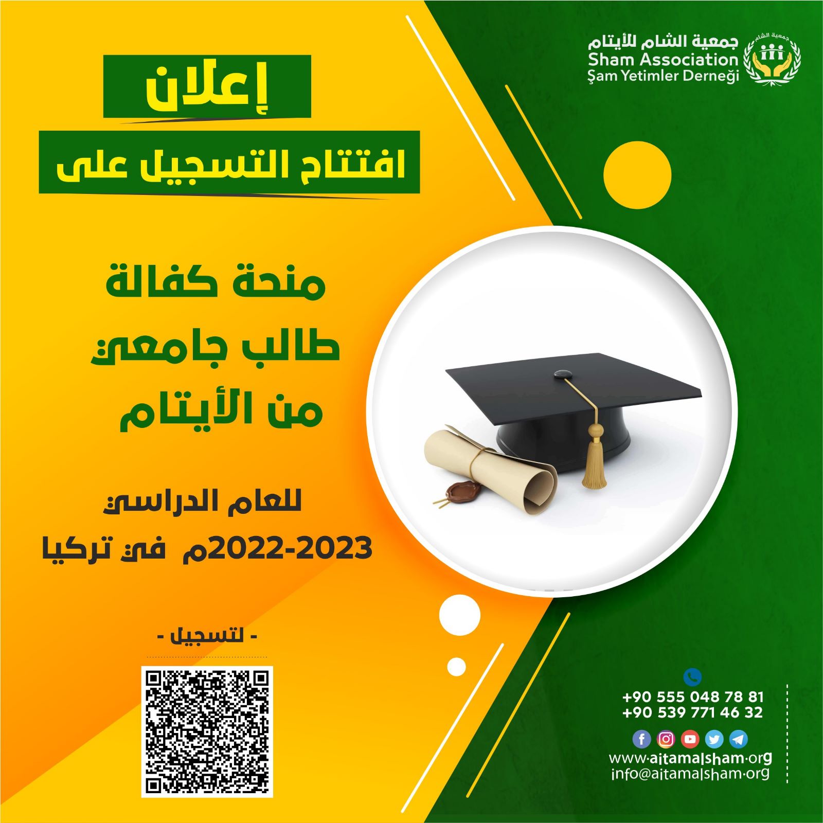 تعلن جمعية الشام لرعاية الأيتام عن تمديد التسجيل على #منحة كفالة طالب جامعي (متوفى والده )للعام الدراسي 2022/2023 م في تركيا