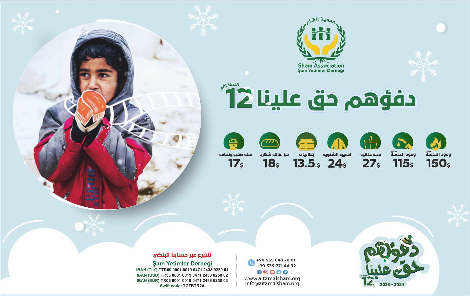 - لأجلِ هذا أطلقت جمعيةُ الشامِ للأيتام حملةَ الشتاء 12 {دفؤهم حقٌ علينا} لإغاثة الأيتام ومساندتهم.
