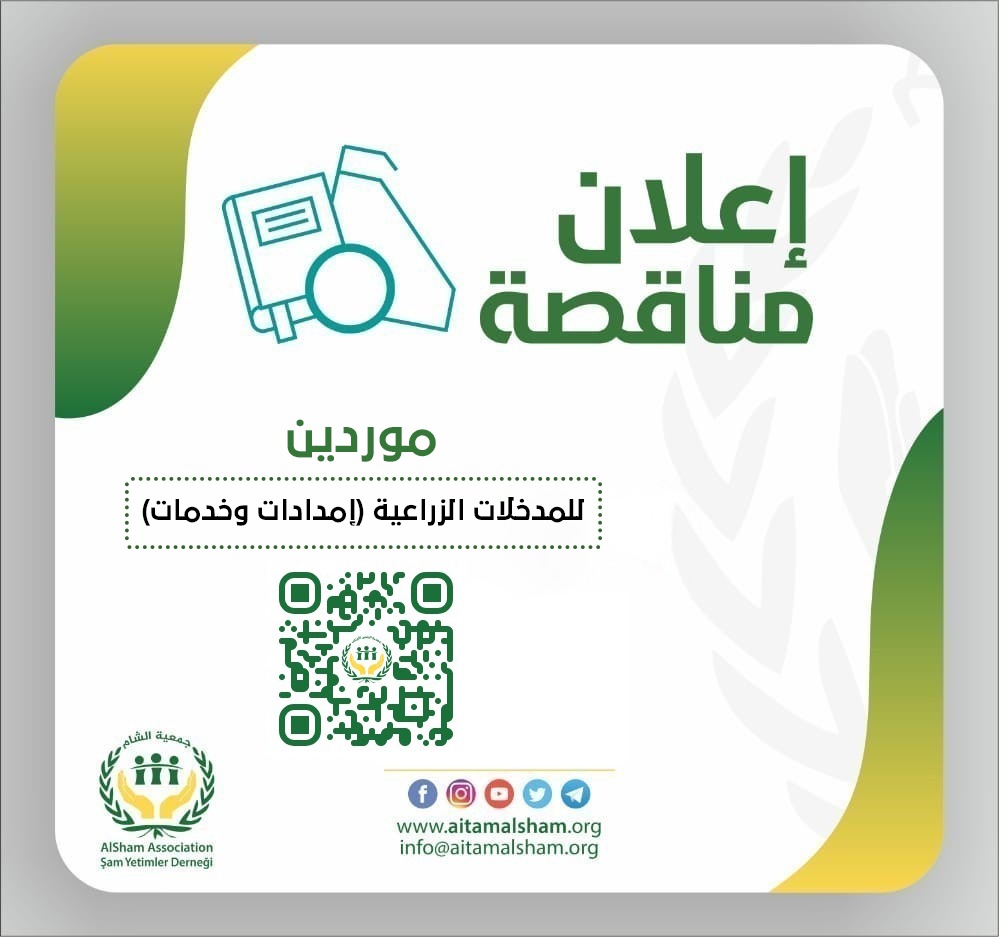 تعلن #جمعية_الشام_لرعاية_وكفالة_الأيتام عن رغبتها بالتعاقد مع موردين محتملين للمدخلات الزراعية (إمدادات وخدمات) في سوريا ودول الجوار ، لدعم مشروع #زراعة_الخضار في #محافظة_إدلب ، #سوريا ، وفق المعطيات التالية: