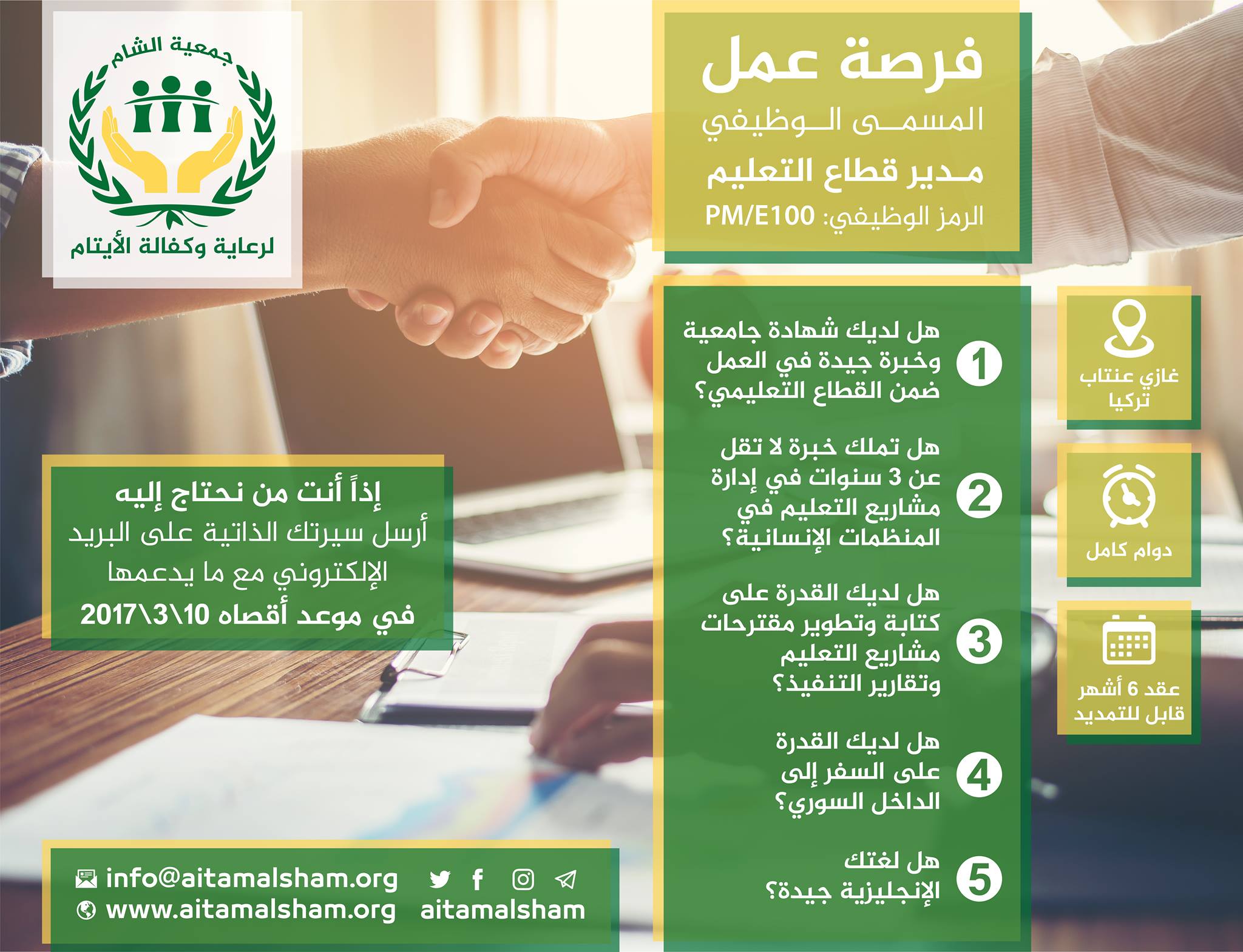 إذاً أنت من نحتاج إليه، أرسل سيرتك الذاتية على البريد الإلكتروني مع ما يدعمها في موعد أقصاه 10\3\2017