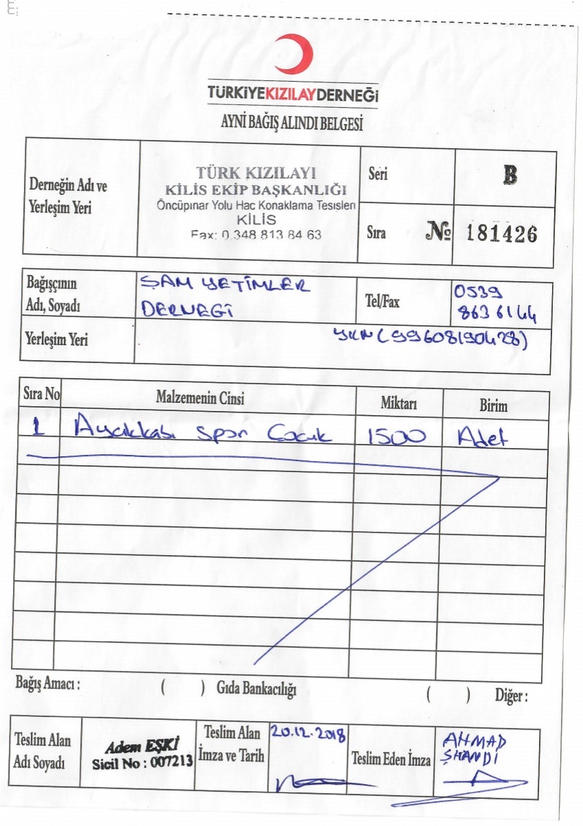 ادخال 1500 بوط شتوي من معبر باب السلامة لمنطقة درع الفرات في الشمال السوري مقدمة من اهل الخير وقد تم ادخال السلل عن طريق الهلال الاحمر التركي جزاهم الله خيرا ليوزع على عوائل الايتام في منطقة درع الفرات