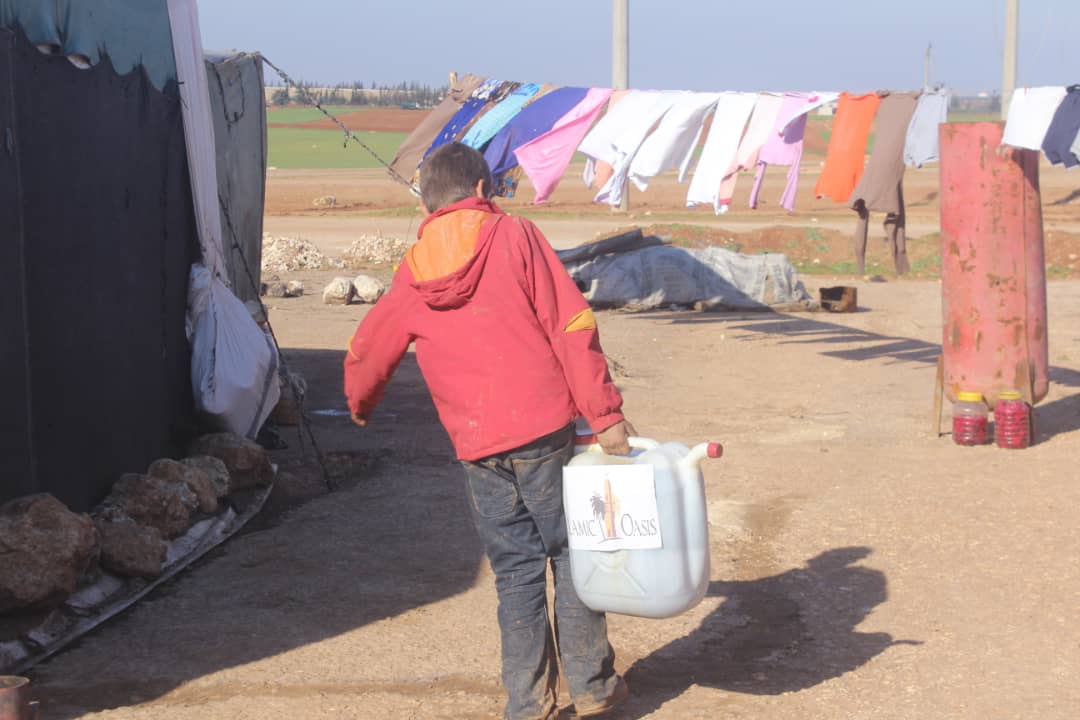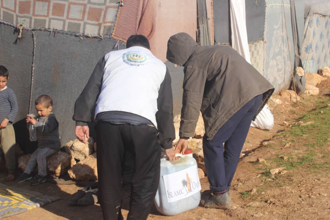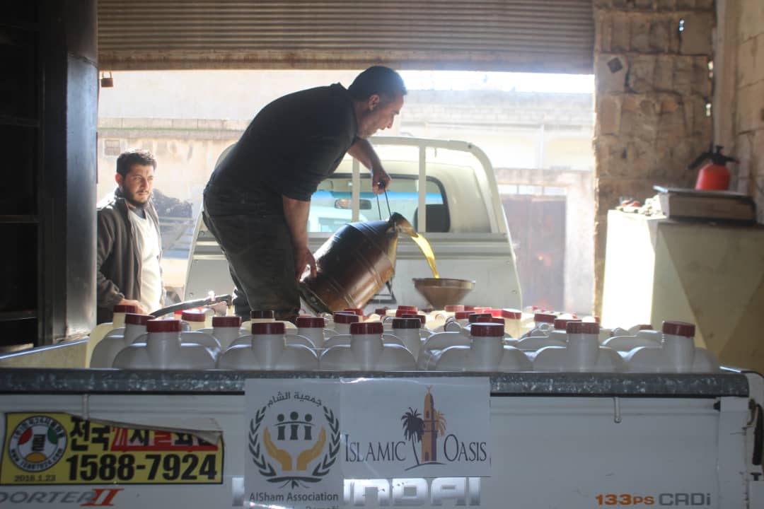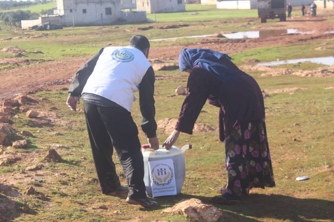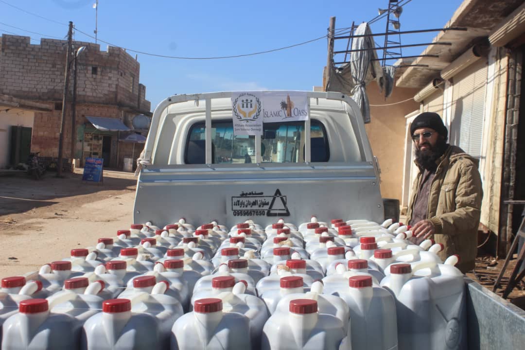 توزيع 1250 لتر مازوت من النوع الممتاز على 50 عائلة من العوائل المنكوبة والمتضررة من السيول والامطار من الأيتام كل عائلة 25 ليتر حول سراقب بدعم من اسلاميك اويسيس ضمن حملة حملة لنقف معهم ونخفف من معاناتهم