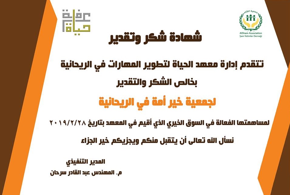 أقام معهد الحياة لتطوير المهارات في 28/2/2019 سوقا خيريا، ساهمت فيه كل من جمعية خير أمة وملبوسات نور الدين في الريحانية.