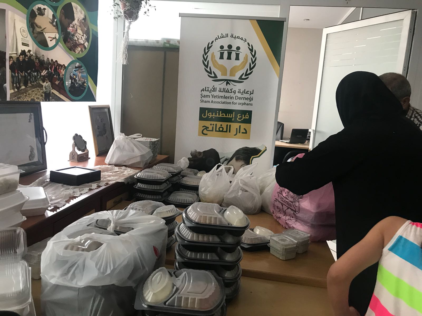 فقد تم تقديم مايتراوح مابين 280 وجبة الى 320 وجبة يوميا لعوائل الأيتام خارج دار الفاتح بدعم من المطاعم السورية بحي الفاتح حيث وجدنا من اهلنا من السوريين من اصحاب المطاعم تجاوبا وحبا للمساهمة وللخير فهناك من قدم يوميا وجبة واحدة وهناك من قدم يوميا 60 وجبة جزاهم الله جميعا كل خير