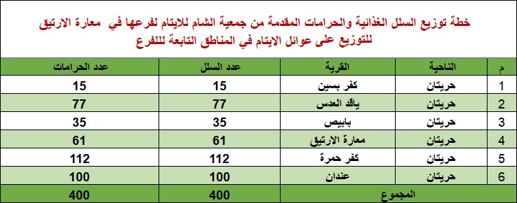 توزيع 400 سلة و400 بطانية على عوائل الأيتام في ريف حلب بفرع معارة الارتيق والفروع التابعة لها ككفر حمرة وعندان وبابيص وياقد العدس وكفر بسين