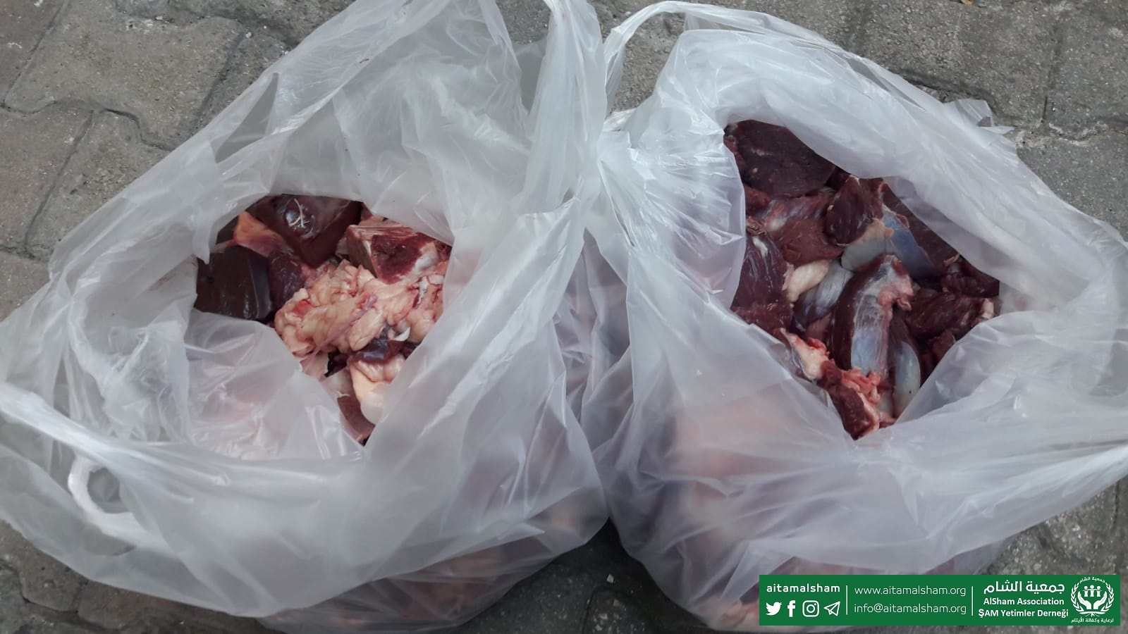 تم بفضل الله توزيع 400 حصة من لحم الاضاحي مقدمة من متبرع تركي من اهل الخير في استانبول الاسيوية وزن الحصة 5 كيلو