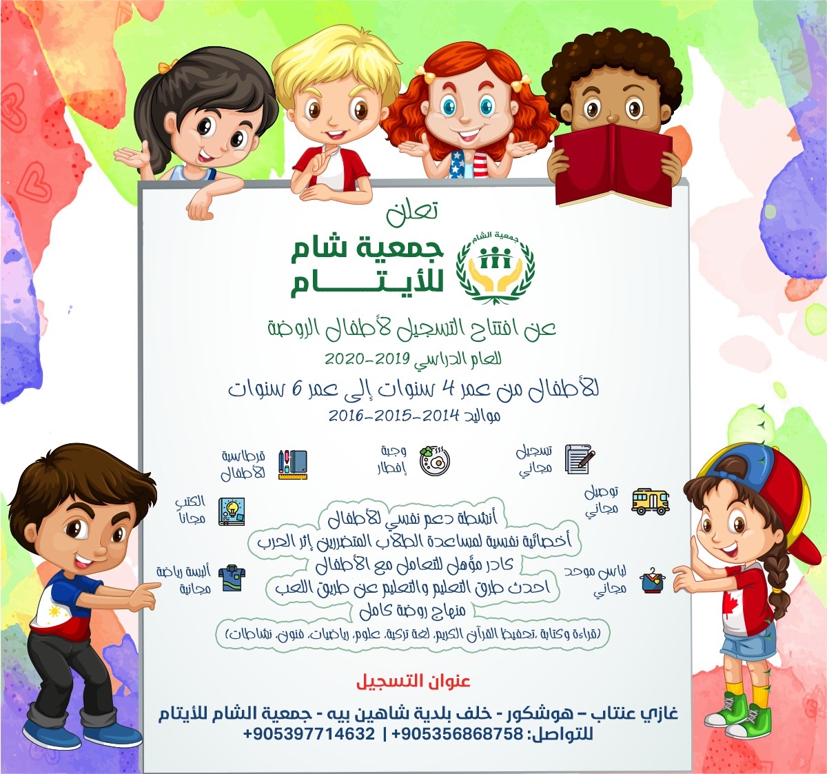 تعلن جمعية الشام للأيتام عن افتتاح التسجيل في روضة براعم الشام للأيتام من في حكمهم للعام الدراسي ٢٠١٩-٢٠٢٠ للأطفال من عمر ٤ سنوات إلى عمر ٦ سنوات مواليد ٢٠١٤-٢٠١٥-٢٠١٦