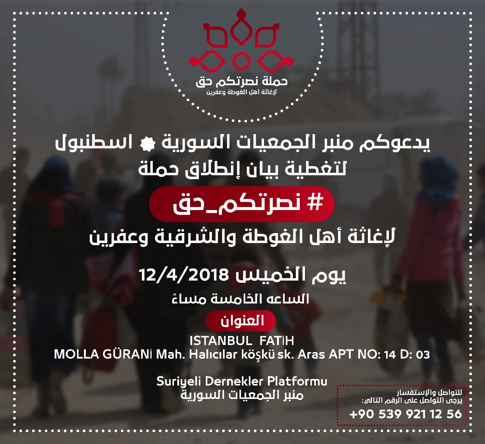شارك فرع جمعية الشام للأيتام في استانبول الاسيوية في حملة نصرتهم حق ضمن مشاركة الجمعية لاغاثة اهلنا النازحين من الغوطة الشرقية التي اطلقتها منبر الجمعيات السورية حيث تبرع الاخوة الاتراك والسوريين في استانبول الاسيوية بالمساعدات وقد قام فريق الاخوة من موظفين ومتطوعين في فرع الاسيوية وبمساعدة من امهات دار السلطان عبد الحميد برتتيب هذه المساعدات وقد بلغت حتى تاريخ اليوم 200 طرد كبير