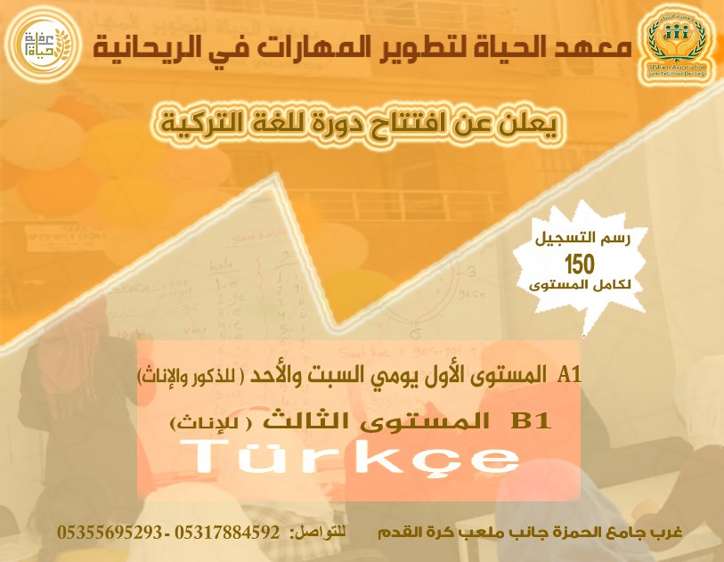 يعلن معهد الحياة لتطوير المهارات عن افتتاح دورة جديدة للغة التركية في الريحانية