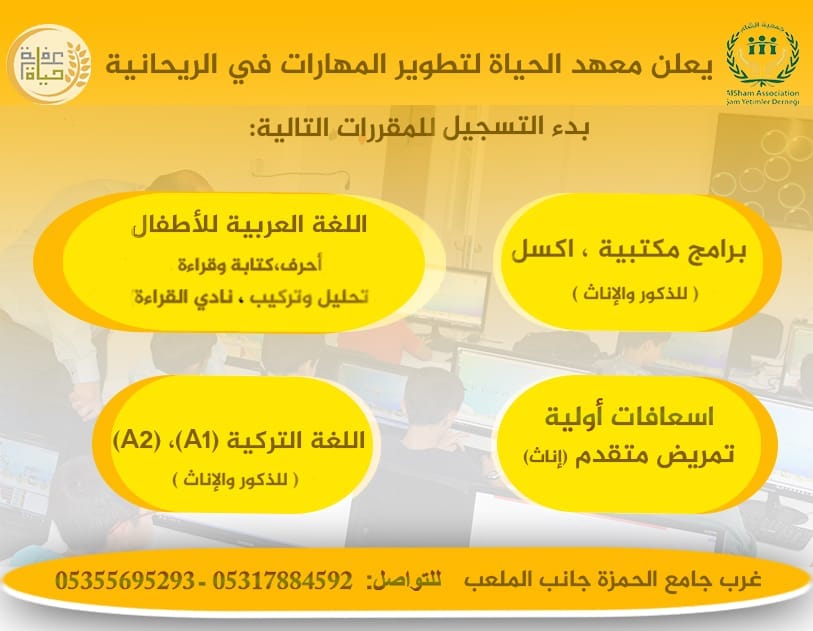 يعلن معهد الحياة لتطوير المهارات في الريحانية بدء التسجيل للمقررات المذكورة في الاعلان ..