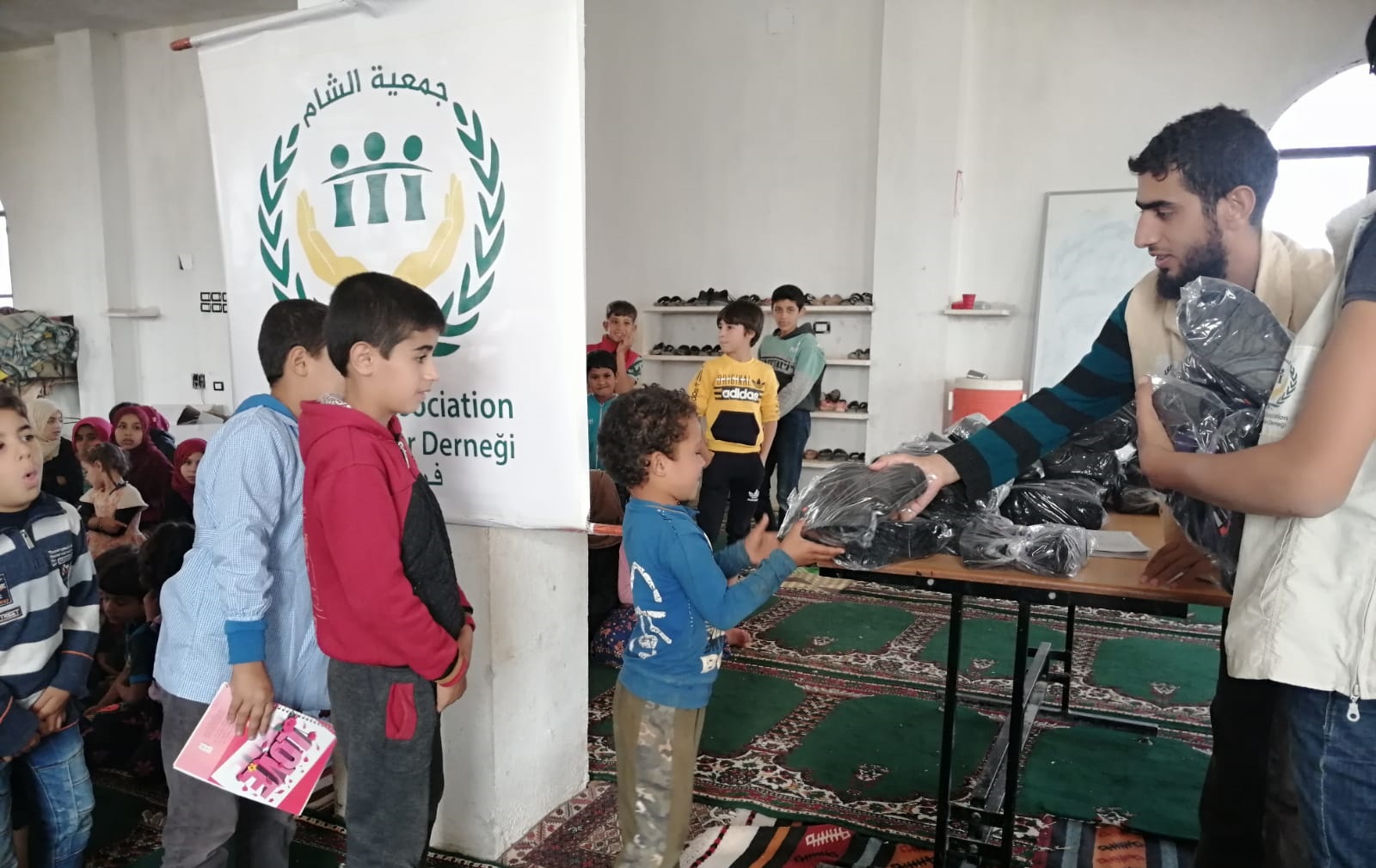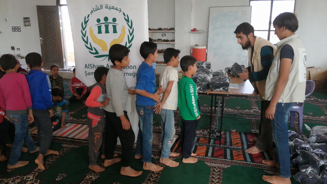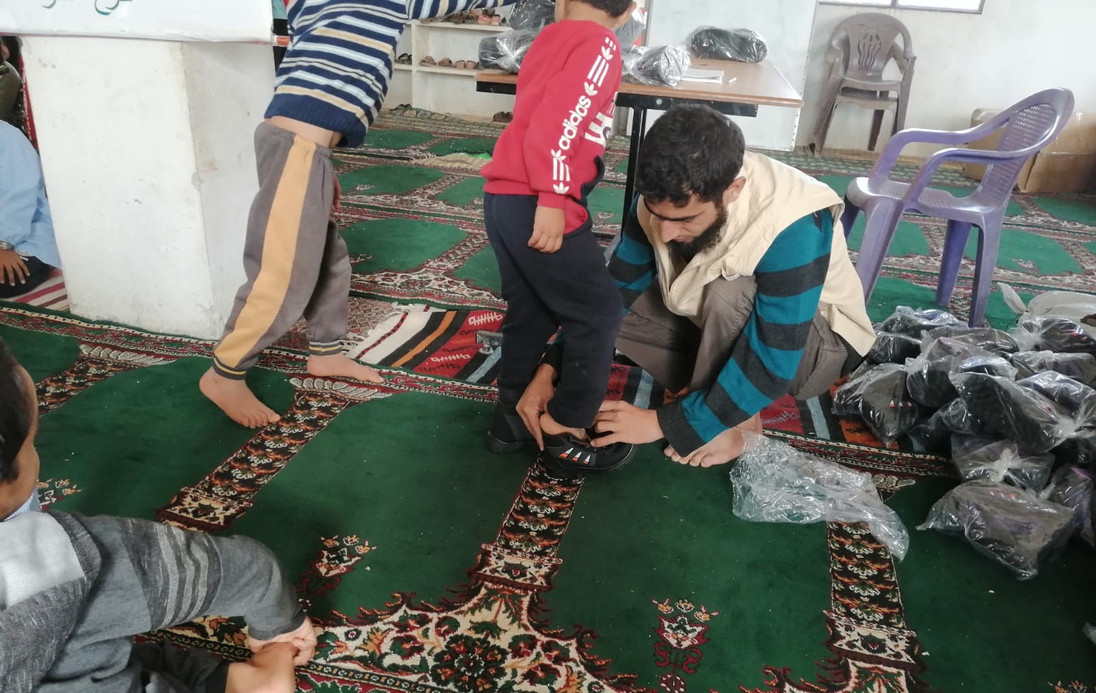 توزيع أحذية شتوية لجميع الأطفال في قرية الشام للأيتام بسرمدا
