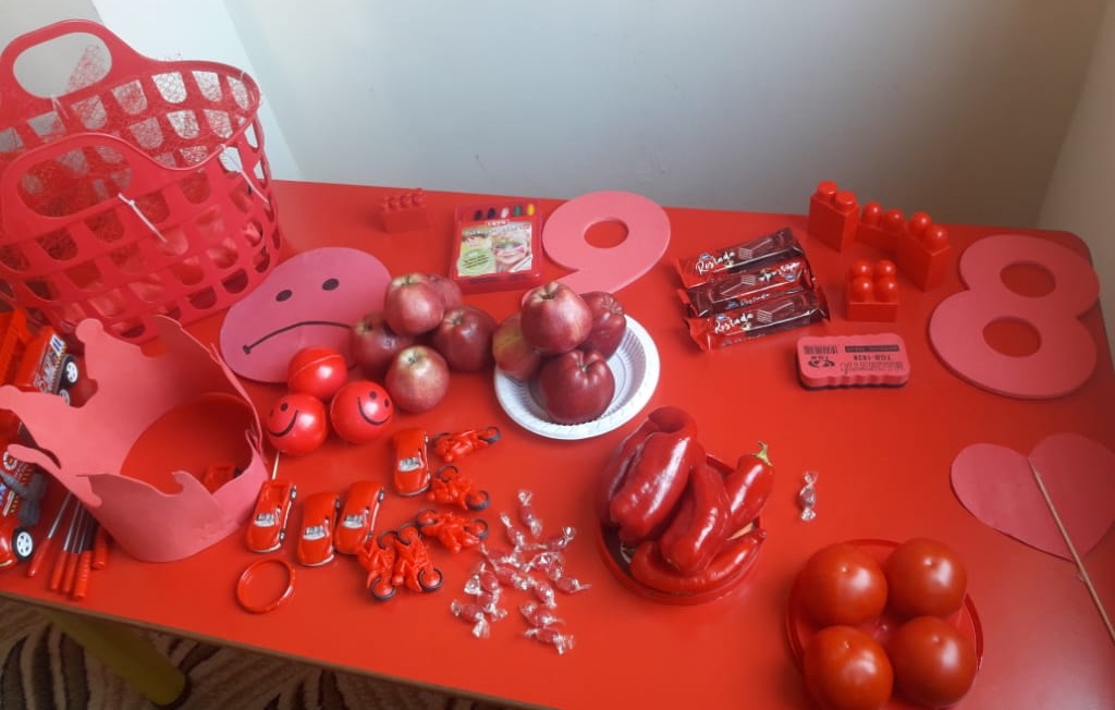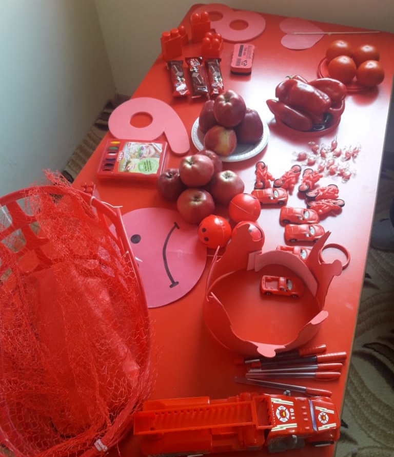 حيث جمعوا ما في الروضة من مواد باللون الأحمر واستعانوا بها لتعريف الاطفال باللون الأحمر