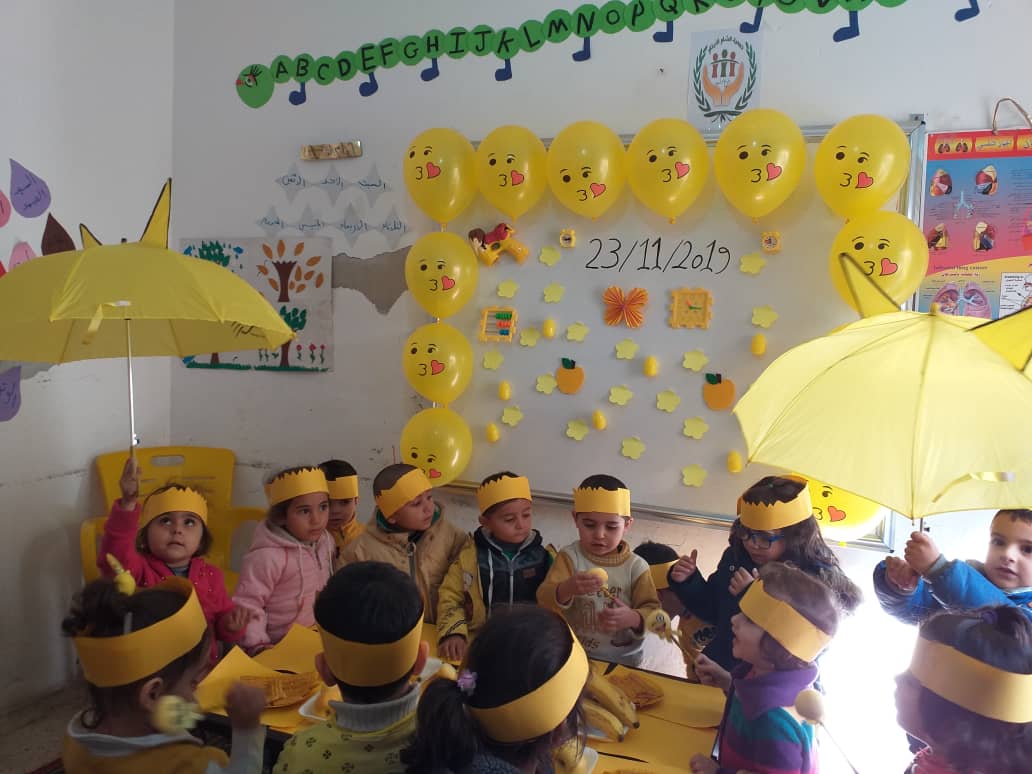 حيث جمعوا ما في الدار والروضة من مواد باللون الأصفر واستعانوا بها لتعريف الاطفال باللون الأصفر