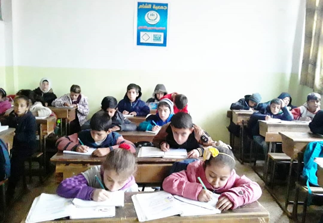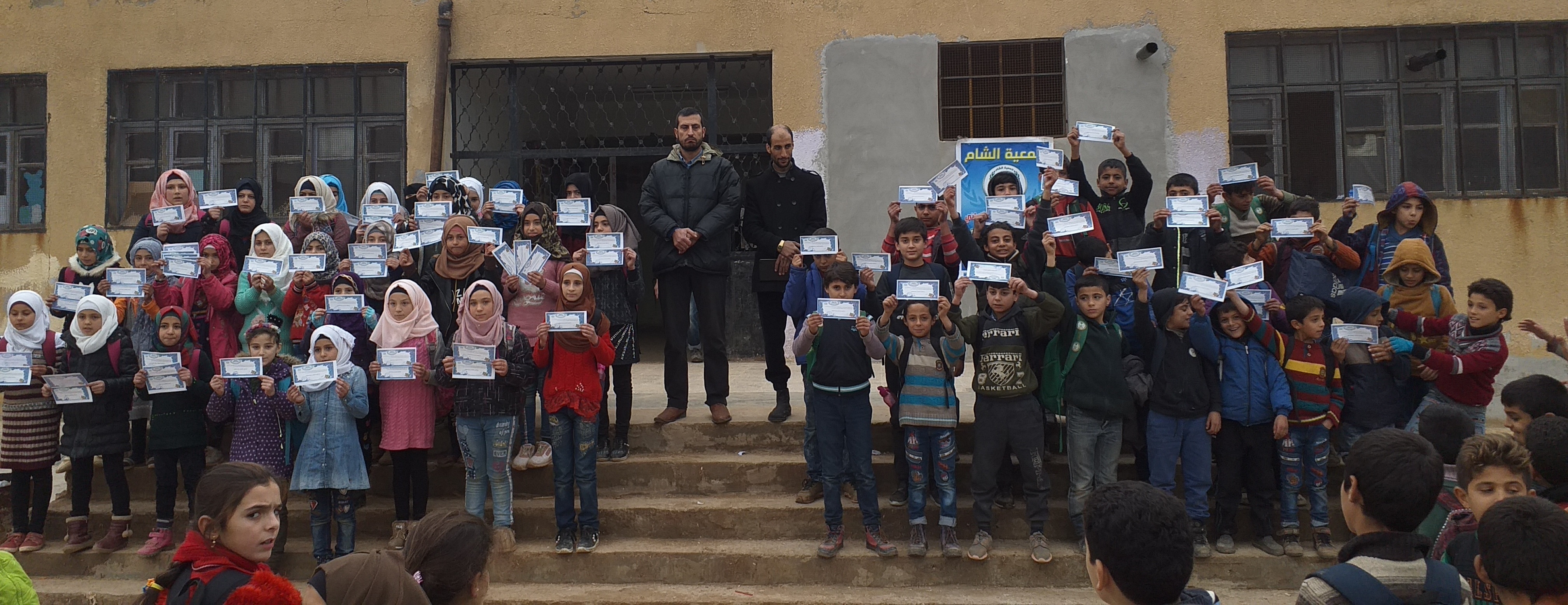 تكريم الطلاب الذين نالوا العلامة التامة في المذاكرات الثانية لهذا العام في مدرسة الشام في بلدة كللي في ريف ادلب في الشمال السوري