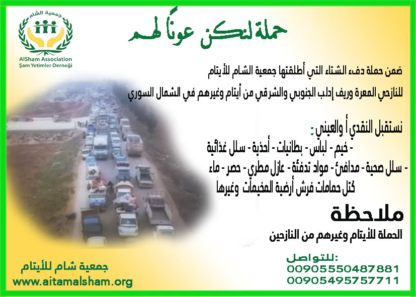 ضمن حملة دفء الشتاء التي اطلقتها جمعية الشام للأيتام للنازحين من الأيتام وغيرهم من المعرة وغيرها في الشمال السوري تم بحمد الله فتح 10 مخيمات للنازحين وجاري فتح المخيم رقم 11 وتم المساهمة بانشاء 4 مخيمات اخرى