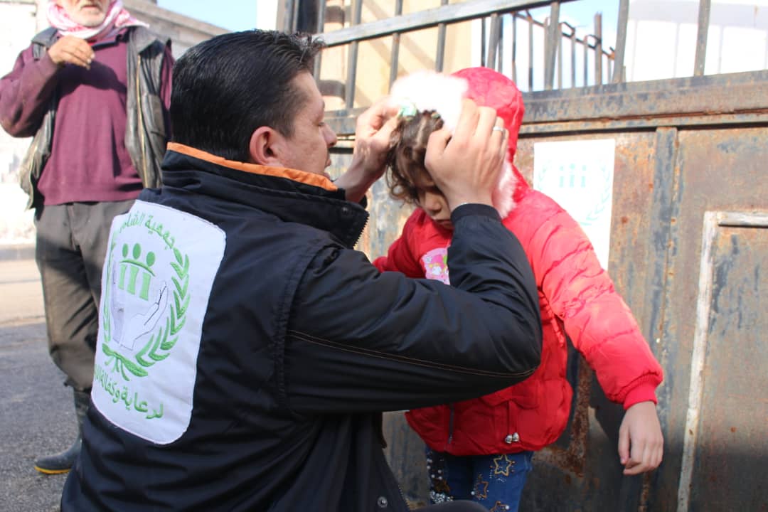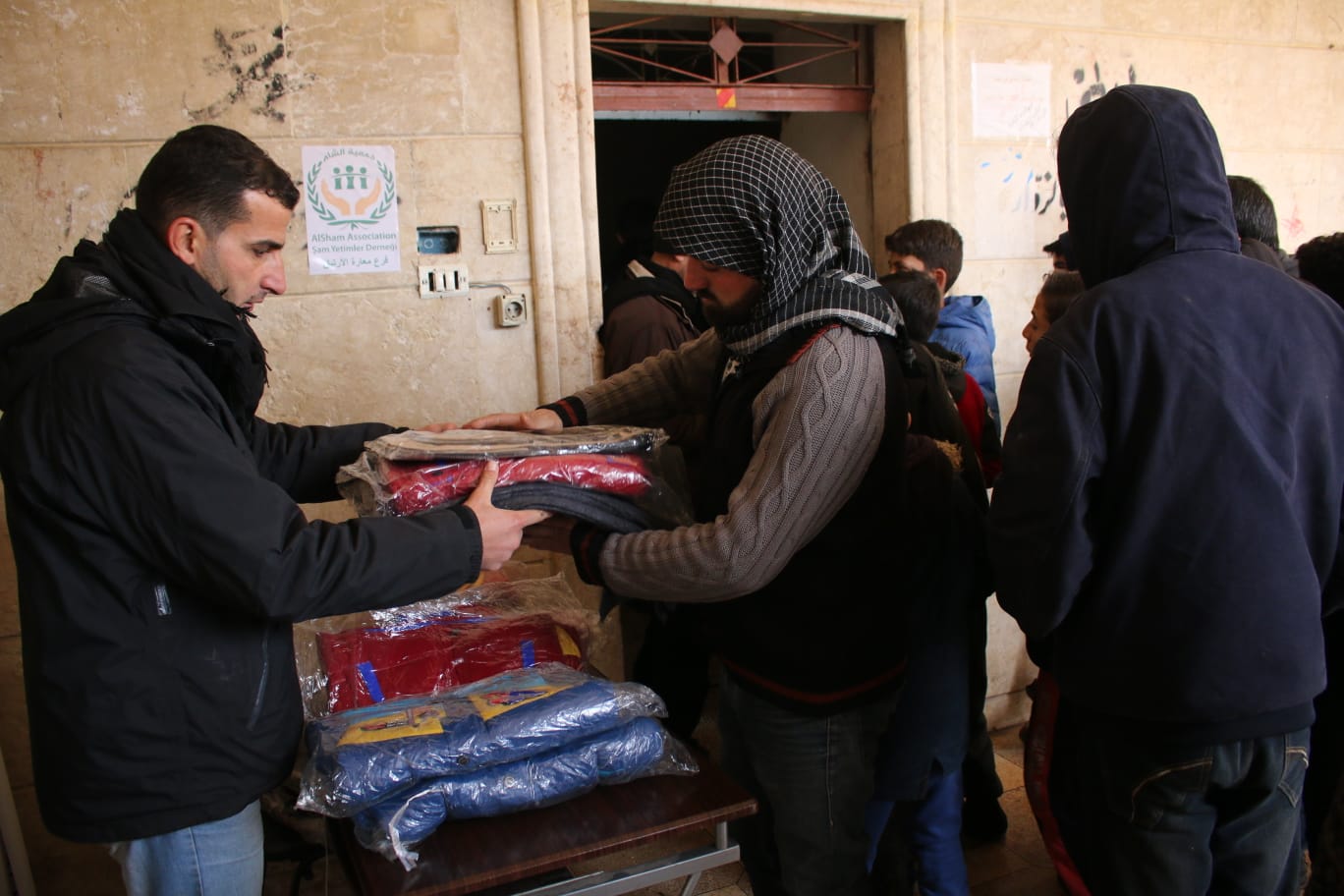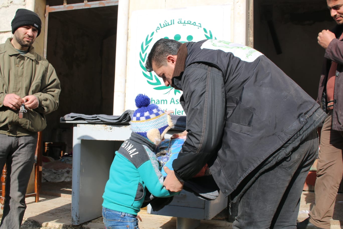 توزيع 1000 جاكيت و1000 حقيبة و1000 بطانية على العوائل الايتام في معارة الارتيق والنازحين اليها بدعم من مؤسسة الرحمة حول العالم