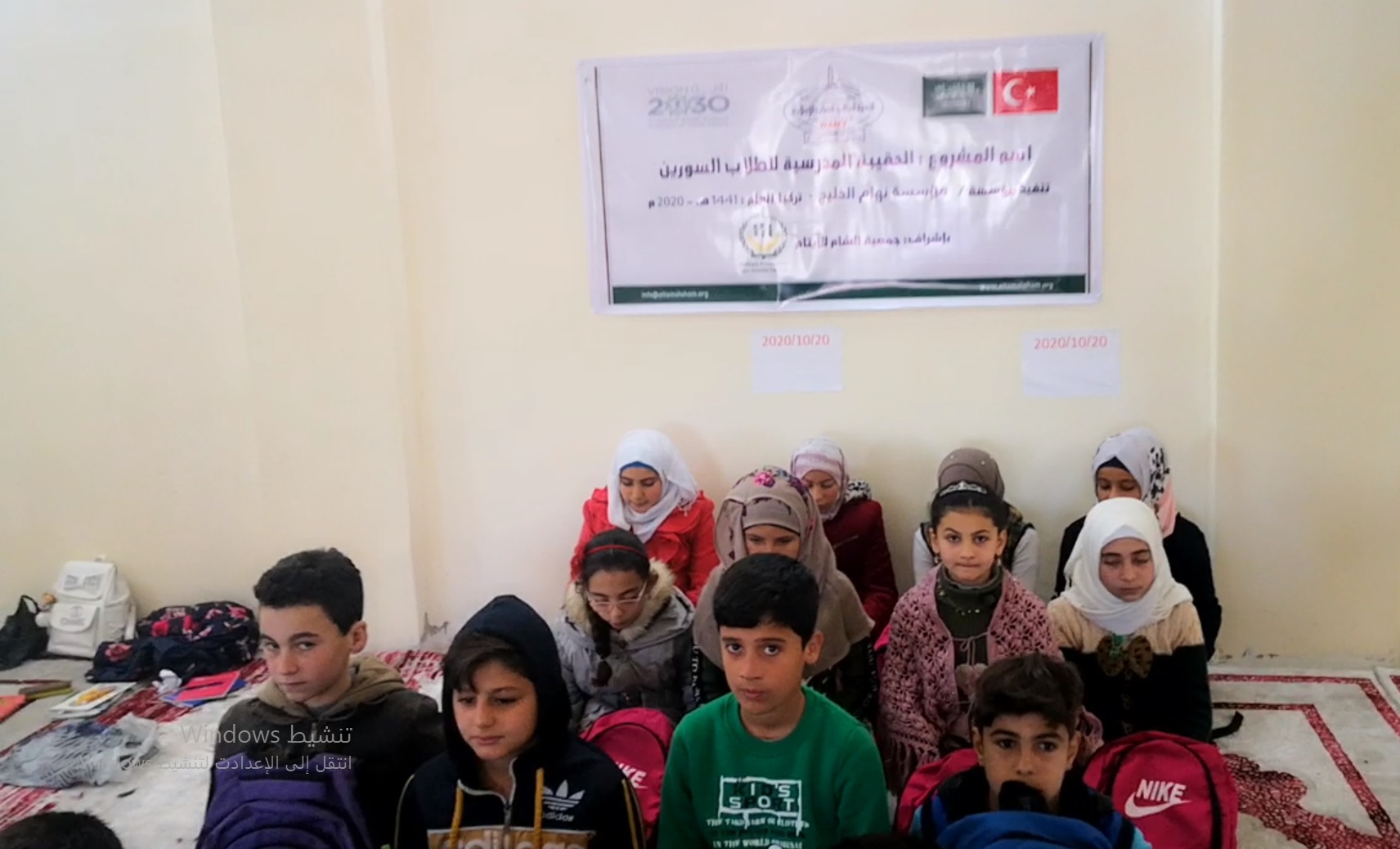 توزيع حقائب على أبنائنا الايتام في مركز أقرا التعليمي في مدينة اعزاز في الشمال السوري بدعم من الندوة العالمية
