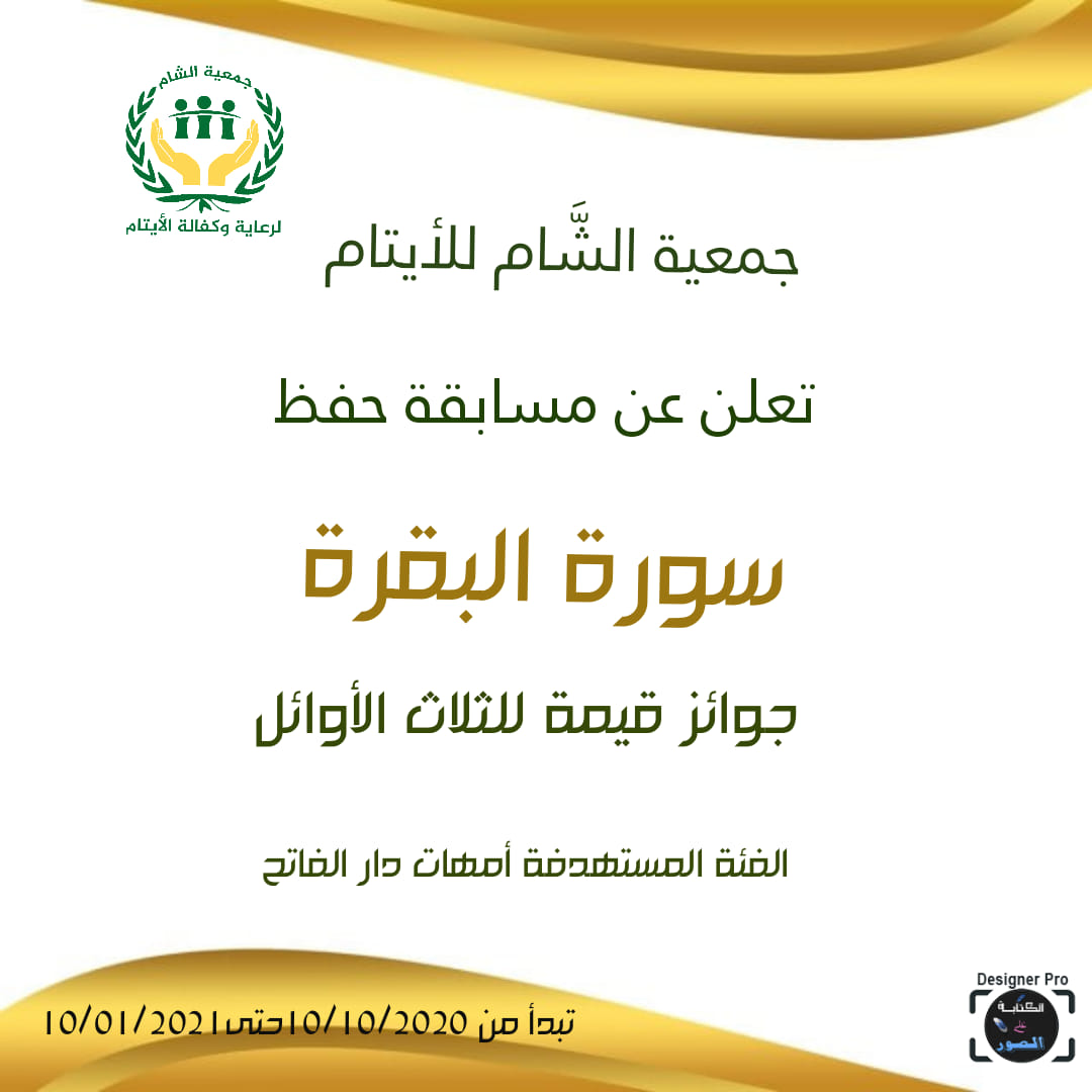 تعلن جمعية الشام للايتام عن مسابقة " وفي ذلك فليتنافس المتنافسون" لحفظ سورة البقرة