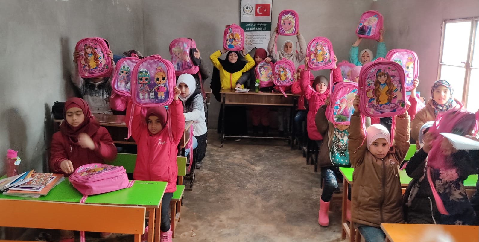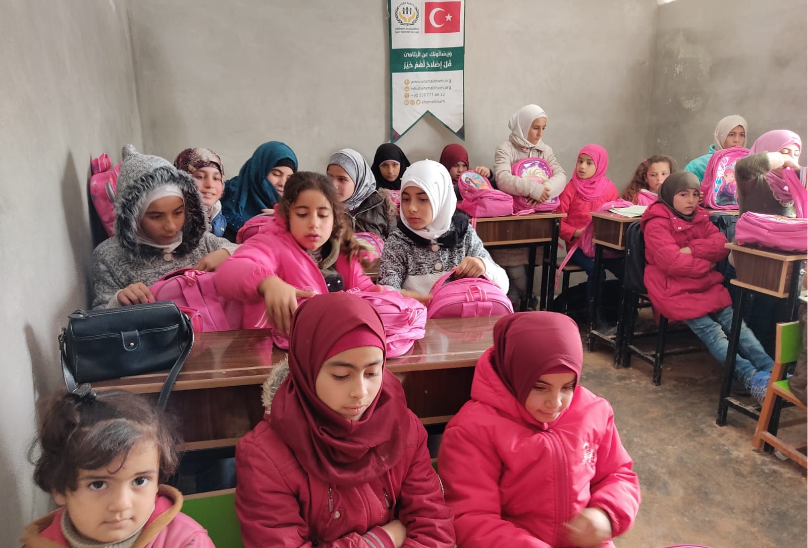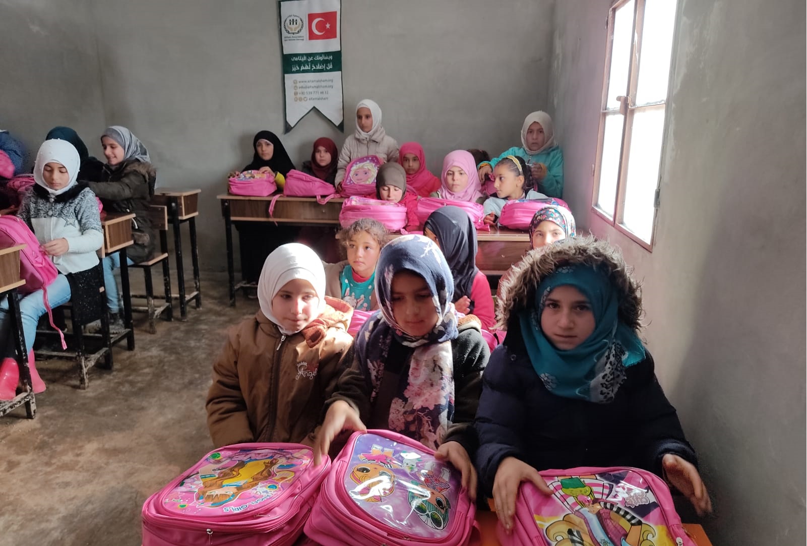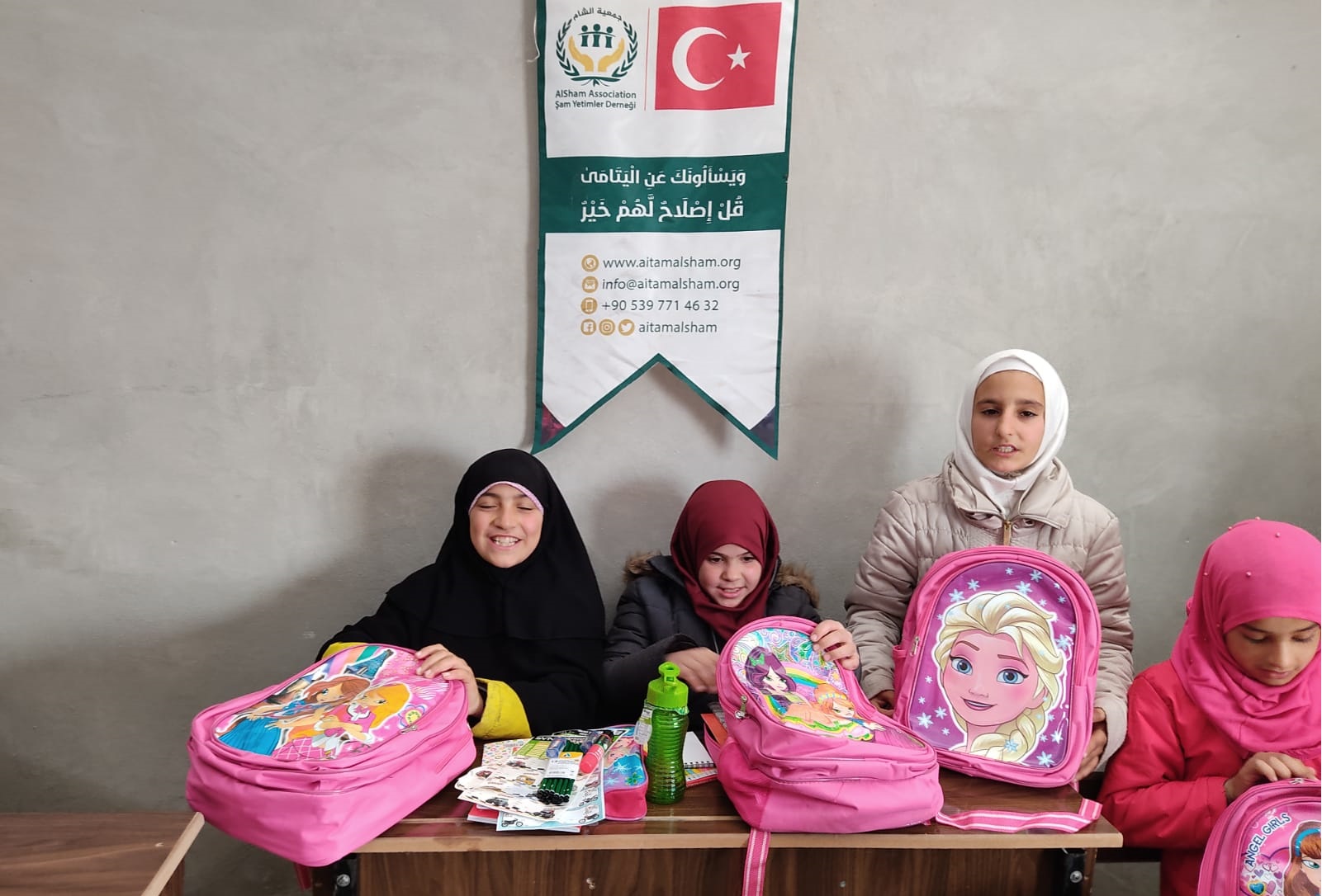 توزيع حقائب على أبنائنا وبناتنا الأيتام في مدرسة الشام الابتدائية في قرية الأيتام في تركمان بارح