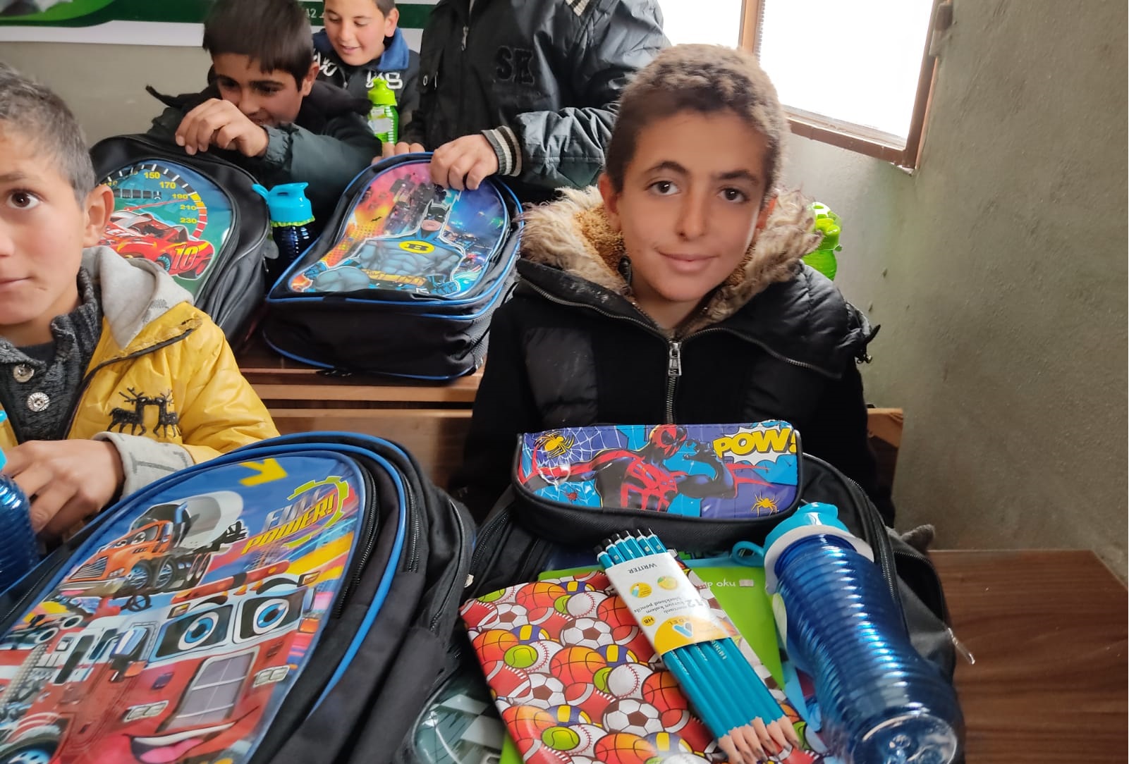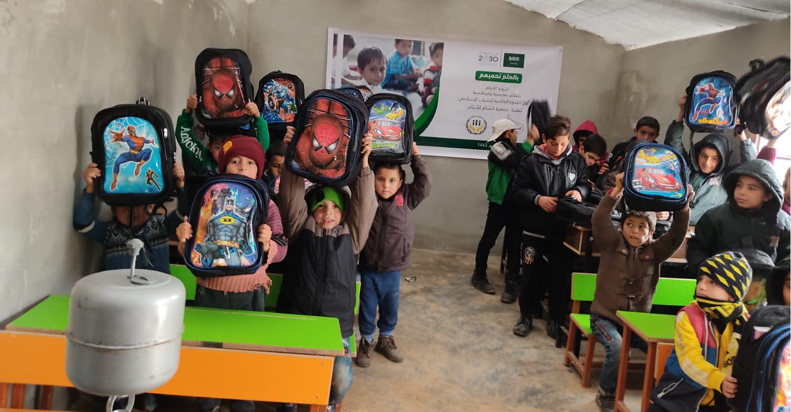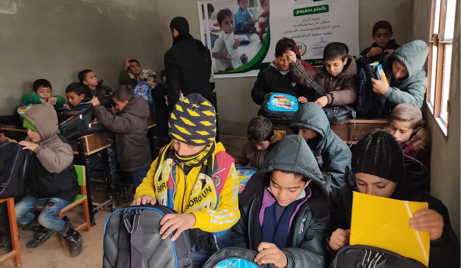 توزيع حقائب على أبنائنا وبناتنا الأيتام في مدرسة الشام الابتدائية في قرية الأيتام في تركمان بارح