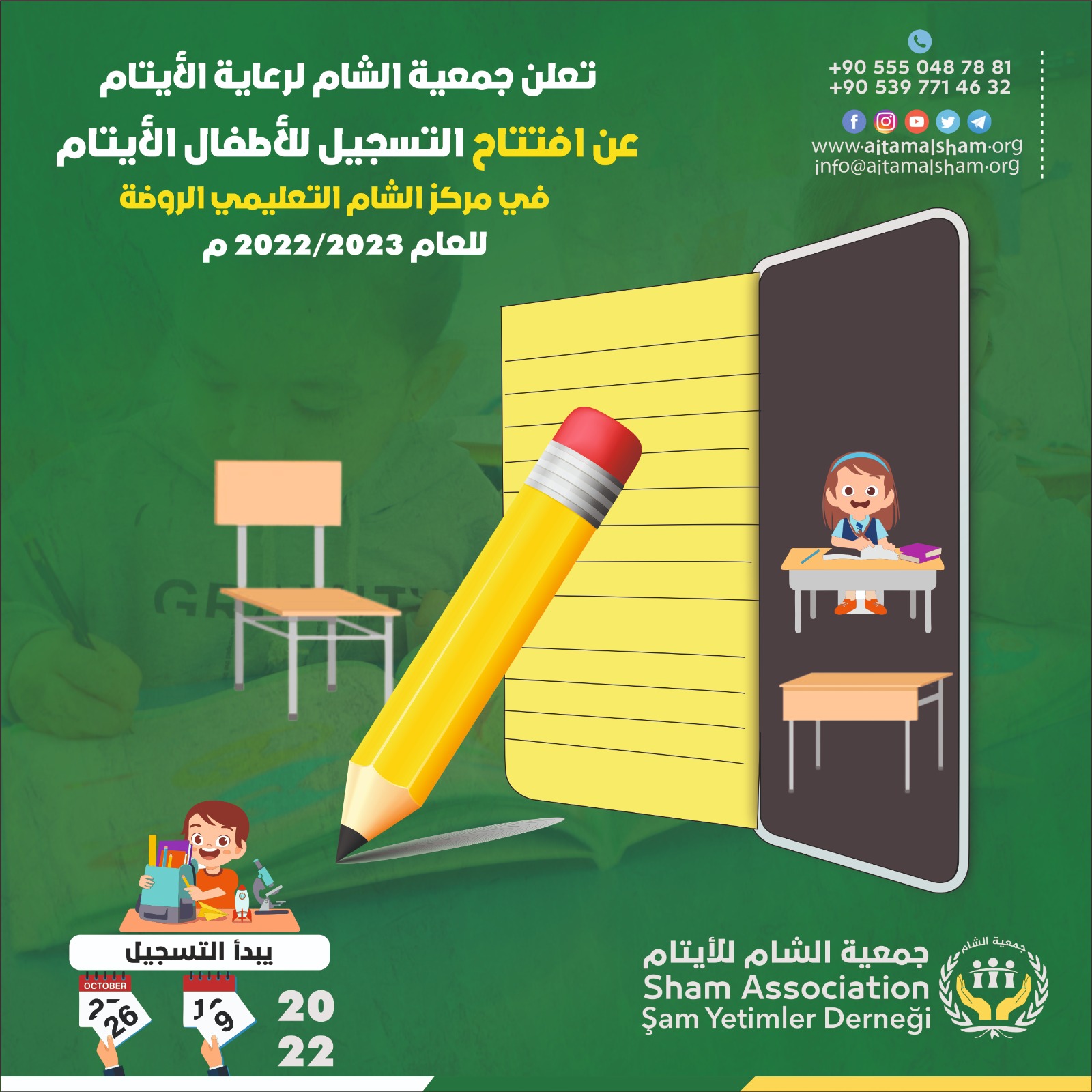 تعلن جمعية الشام للأيتام عن افتتاح التسجيل للأطفال الأيتام في مركز الشام التعليمي ( الروضة ) للعام 2023/2022 م