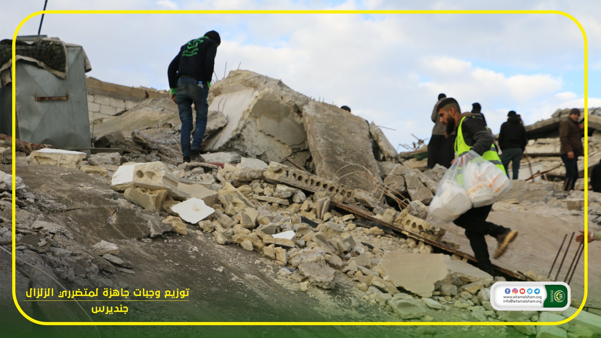 والصور من توزيع وجبات جاهزة تم طبخها وتحضيرها في مطبخ قرية نريمان ووزعت لمتضرري الزلزال في منطقة جنديرس المنكوبة