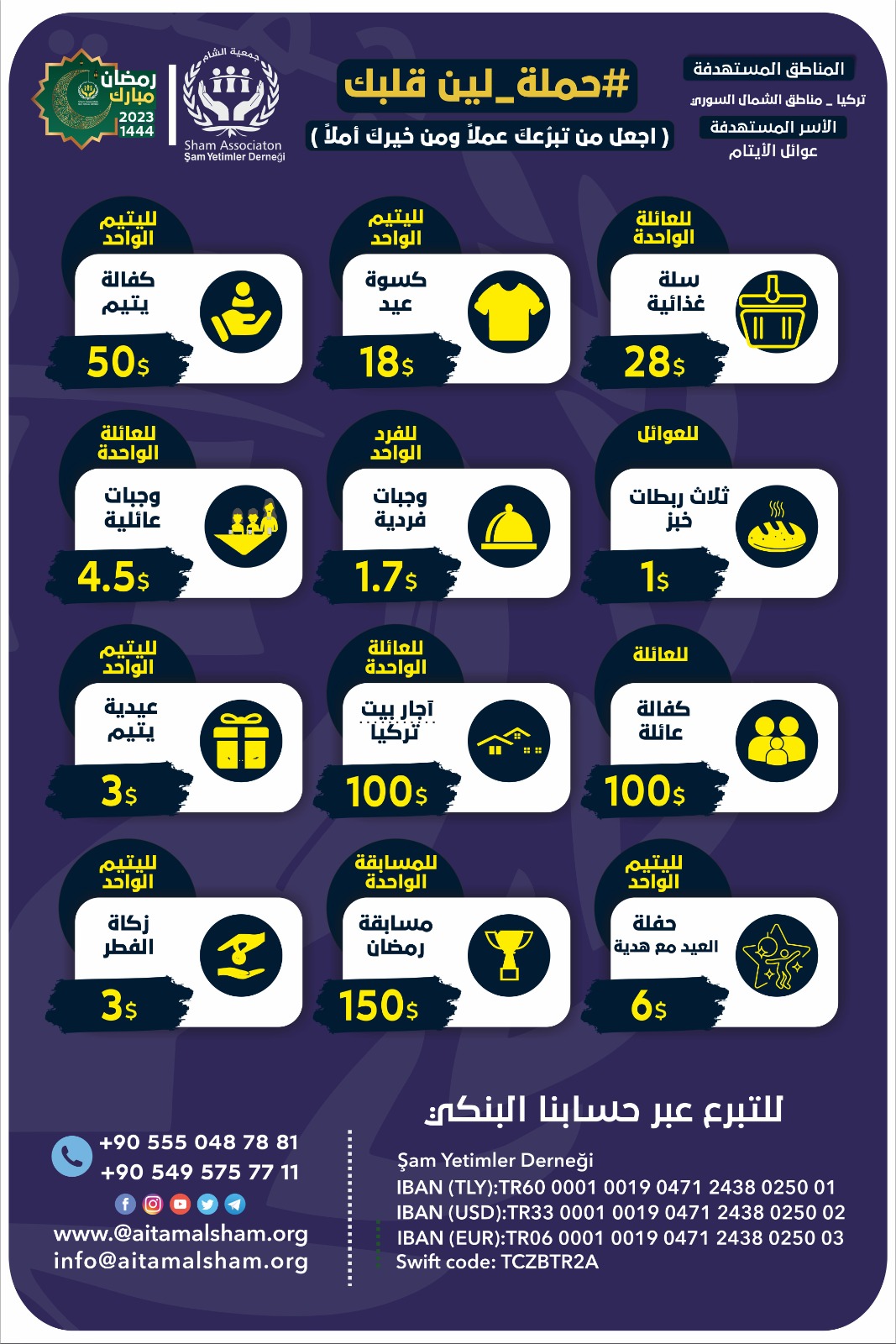كفالات - سلل غذائية - وجبات إفطار - خبز - كسوة العيد - هدايا - عيديات - حلوى العيد - زكاة فطر - آجار البيوت - زكاة مال - مسابقات.