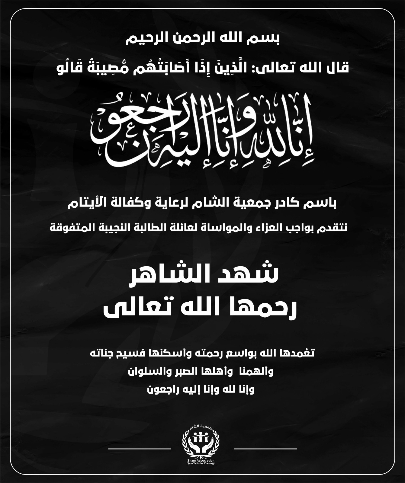 بمزيد من الحزن والأسى تلقينا نبأ وفاة طالبتنا النجيبة شهد الشاهر من دار ضيافة اسطنبول