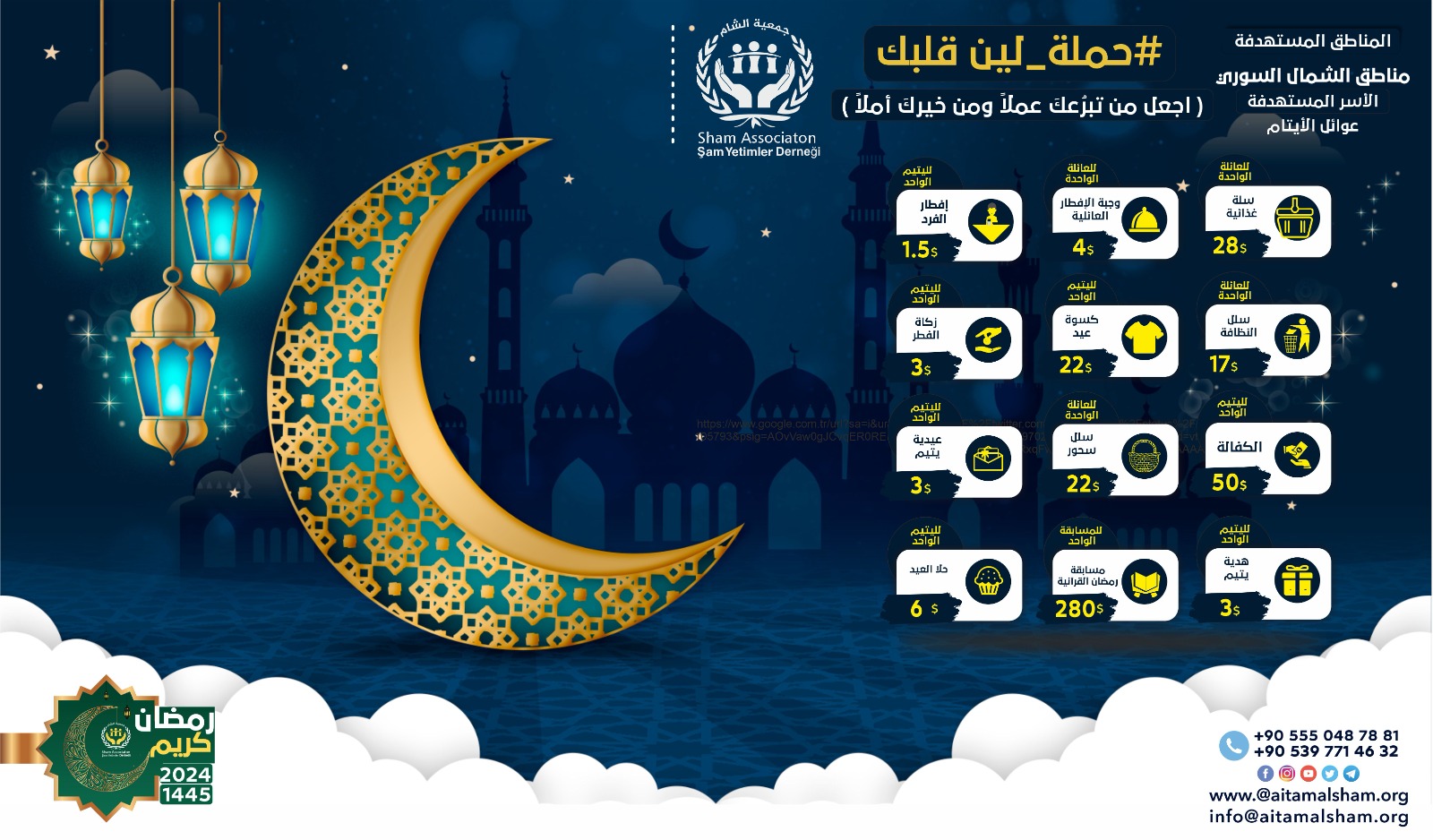تُعلِن جمعية الشام للأيتام عن انطلاق حملتِها للمشاريع الخيرية لشهرِ رمضان المبارك لهذا العام، وتحت شعار: