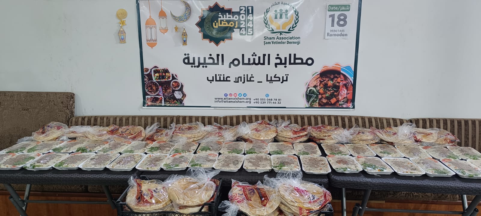 حيث تم اليوم إعداد 1030 #وجبة_إفطار عائلية في اليوم الثامن عشر من رمضان في جميع مطابخ الشام الخيرية و تم توزيعها على عوائل الأيتام ومن في حكمهم.