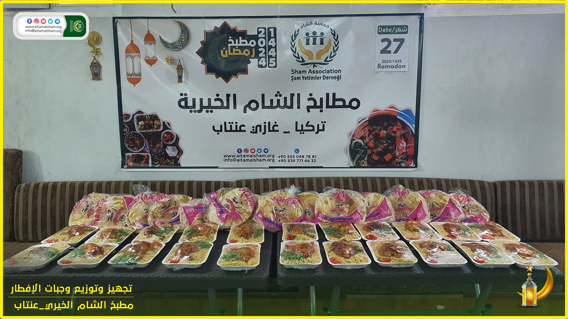 حيث تم اليوم إعداد 1200 #وجبة_إفطار عائلية في اليوم السابع والعشرين من رمضان في جميع مطابخ الشام الخيرية و تم توزيعها على عوائل الأيتام ومن في حكمهم.