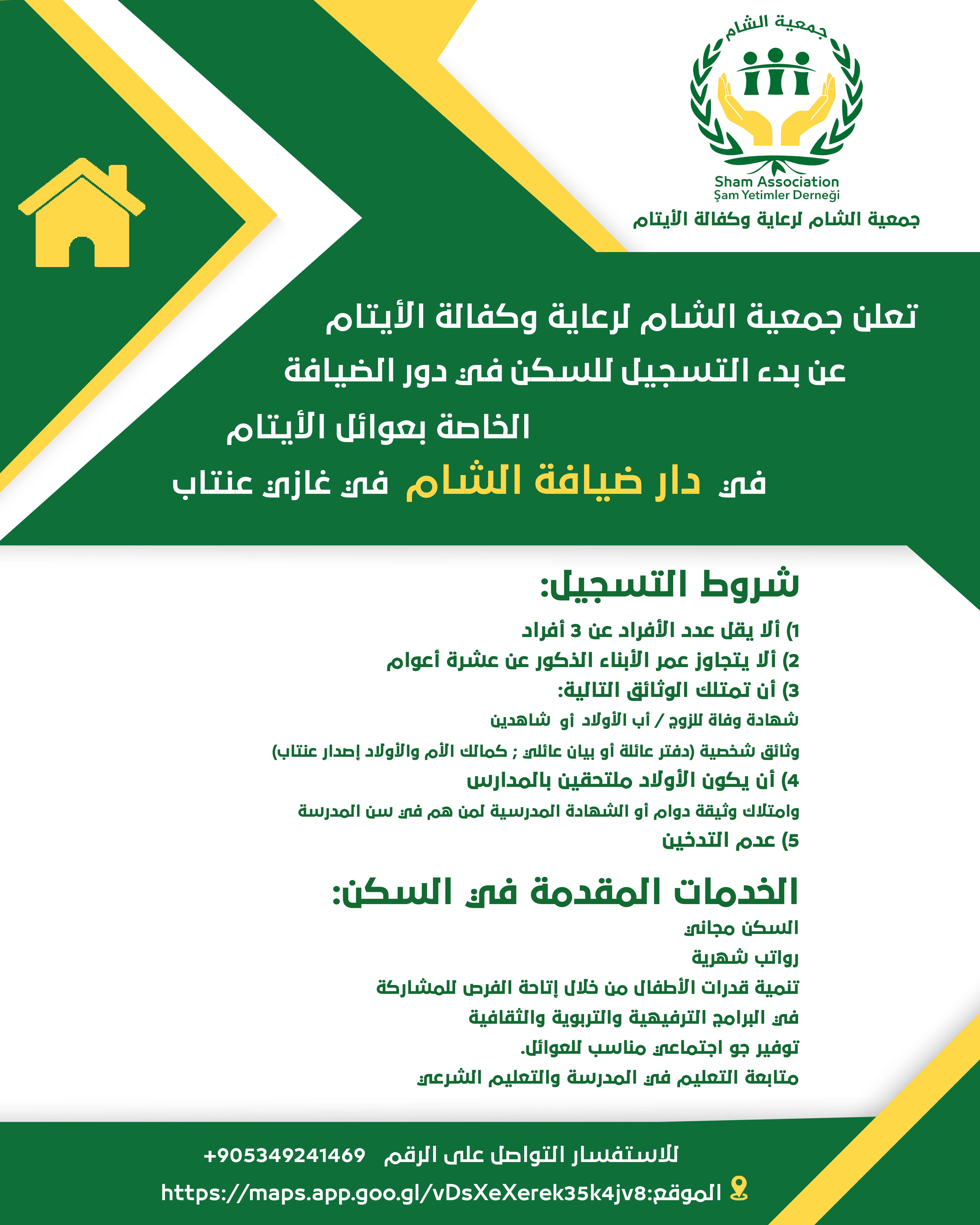 إعلان بدء التسجيل في دور ضيافة الشام لعوائل الأيتام في عنتاب