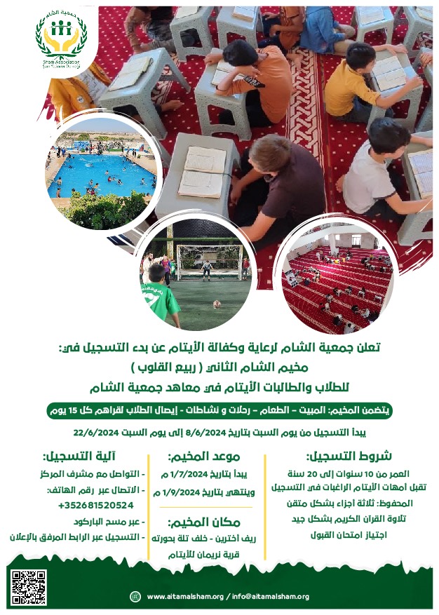 إعلان عن بدء التسجيل في مخيم الشام الثاني في معاهد الشام للأيتام