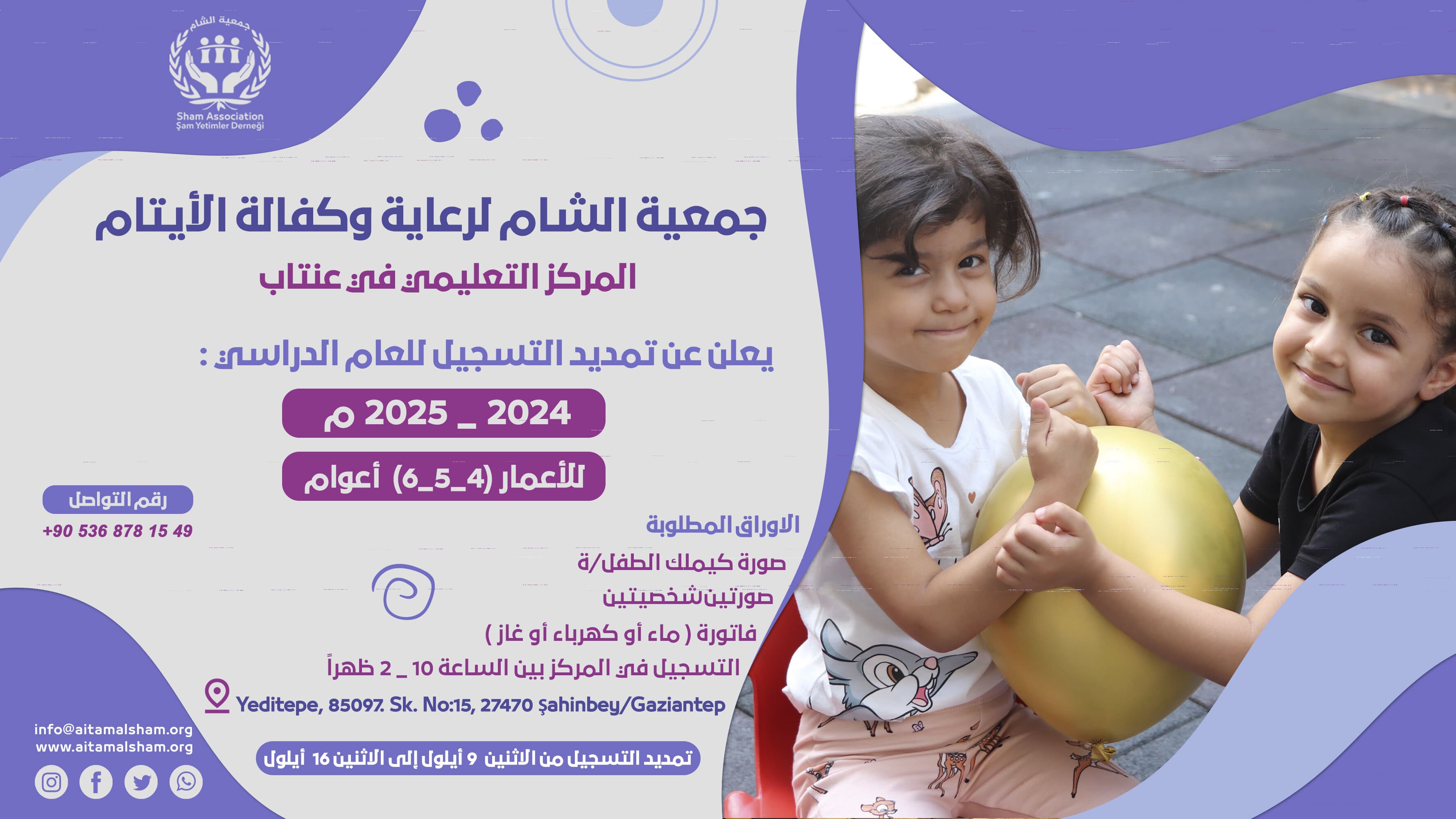 تعلن #جمعية_الشام_لرعاية_وكفالة_الأيتام عن تمديد التسجيل للأطفال الأيتام في #مركز_الشام_التعليمي في غازي عنتاب للعام الدراسي 2025/2024 م