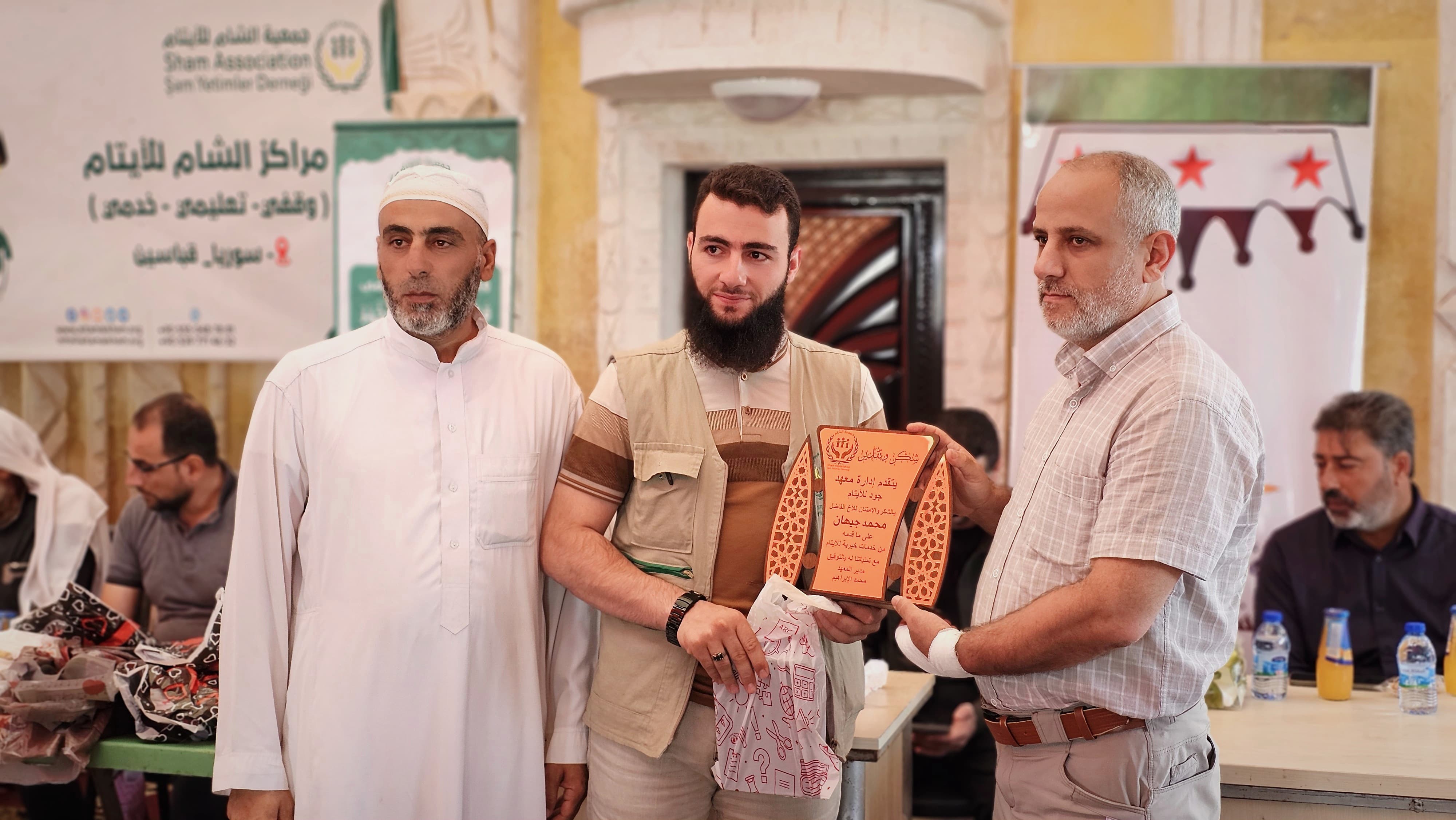 الذي يبلغ عدد طلابه 150 طالب وطالبة. وأثناء حفل التكريم قدمنا للأستاذ جيهان مسؤول وقف الديانه في منطقة جرابلس وقباسين درع شكر وتقدير على جهوده المبذولة في خدمة الأيتام.