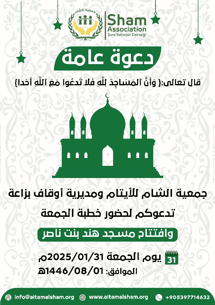 يسرنا دعوتكم لحضور خطبة الجمعة في مسجد هند بنت ناصر بمدينة بزاعة يوم الجمعة 31/01/2025، والمشاركة في افتتاح المسجد بعد صلاة الجمعة .
