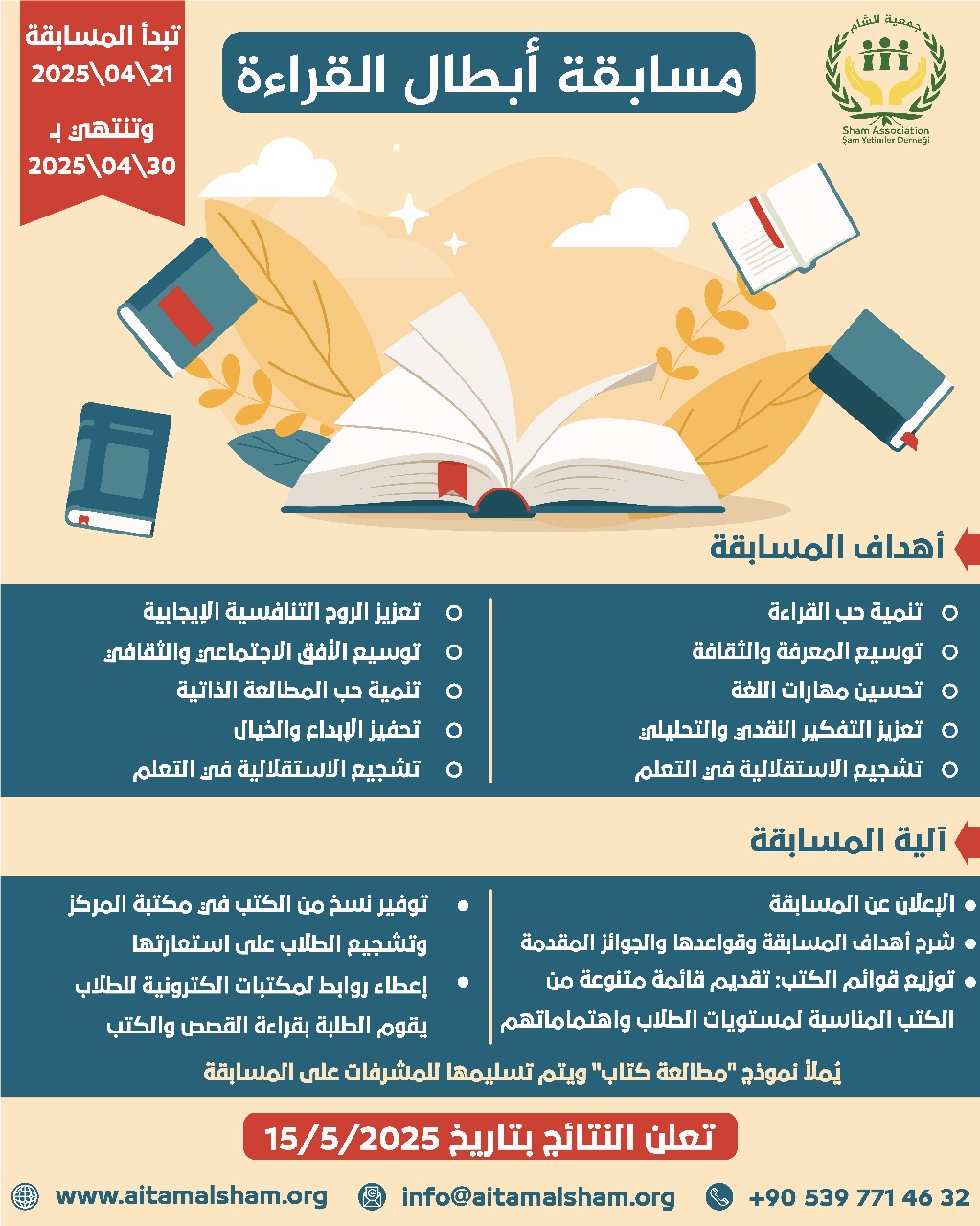 يسر مكتب التربية والتعليم في جمعية الشام لرعاية وكفالة الأيتام أن يعلن عن بدء مسابقة أبطال القراءة الموجهة لأبنائنا وبناتنا وأمهاتنا في دور ومراكز الشام في سوريا وتركيا.