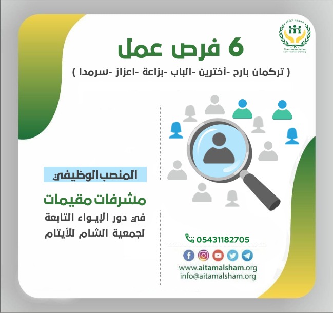 تعلن جمعية الشام للأيتام عن 6 فرص عمل في سوريا