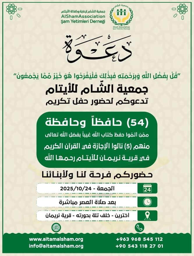 تتشرف #جمعية_الشام_للأيتام بدعوتكم لمشاركتنا فرحتنا الكبرى، وفخرنا بأبنائنا الذين أناروا قلوبهم بحفظ كتاب الله.