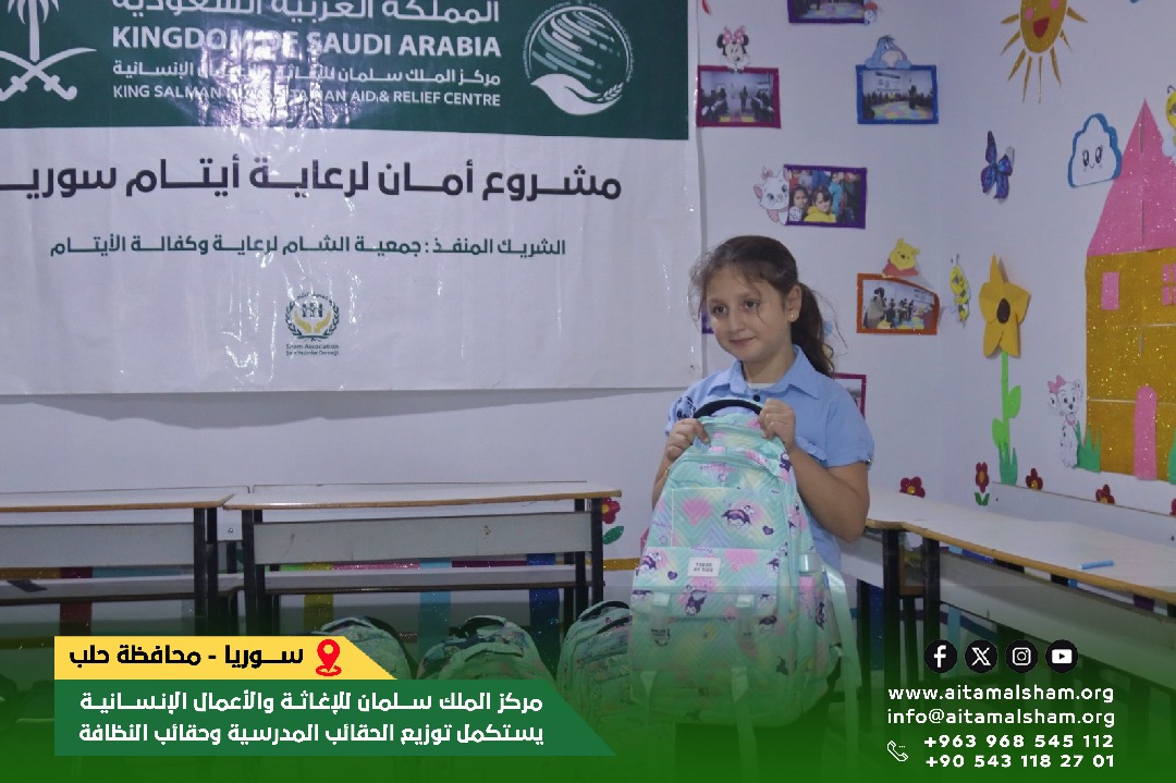 مركز الملك سلمان للإغاثة والأعمال الإنسانية يستكمل توزيع الحقائب المدرسية وحقائب النظافة لـ 600 طفل يتيم بمحافظة حلب في سوريا