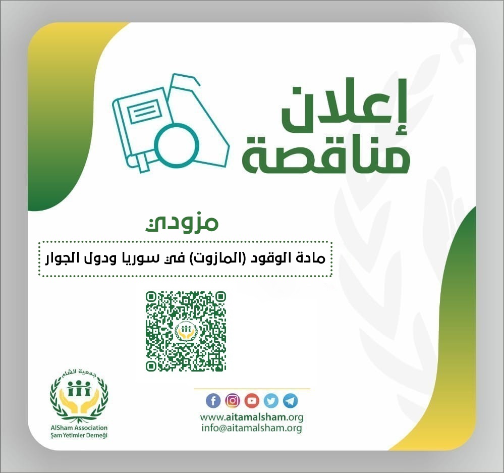 تعلن #جمعية_الشام_للأيتام عن رغبتها بالتعاقد مع موردي #مادة_الوقود (المازوت) في #سوريا ودول الجوار لتسليم كميات مخصصة من المادة لدعم مزارعي القمح ضمن #مشروع_سبع_سنابل_لدعم_الأسر_الزراعية_في_سوريا في محافظة حلب وريفها ، وأيضاً لصياغة عقد إطاري طويل المدى لتغطية احتياجات المشاريع الأخرى في الجمعية من نفس المادة.