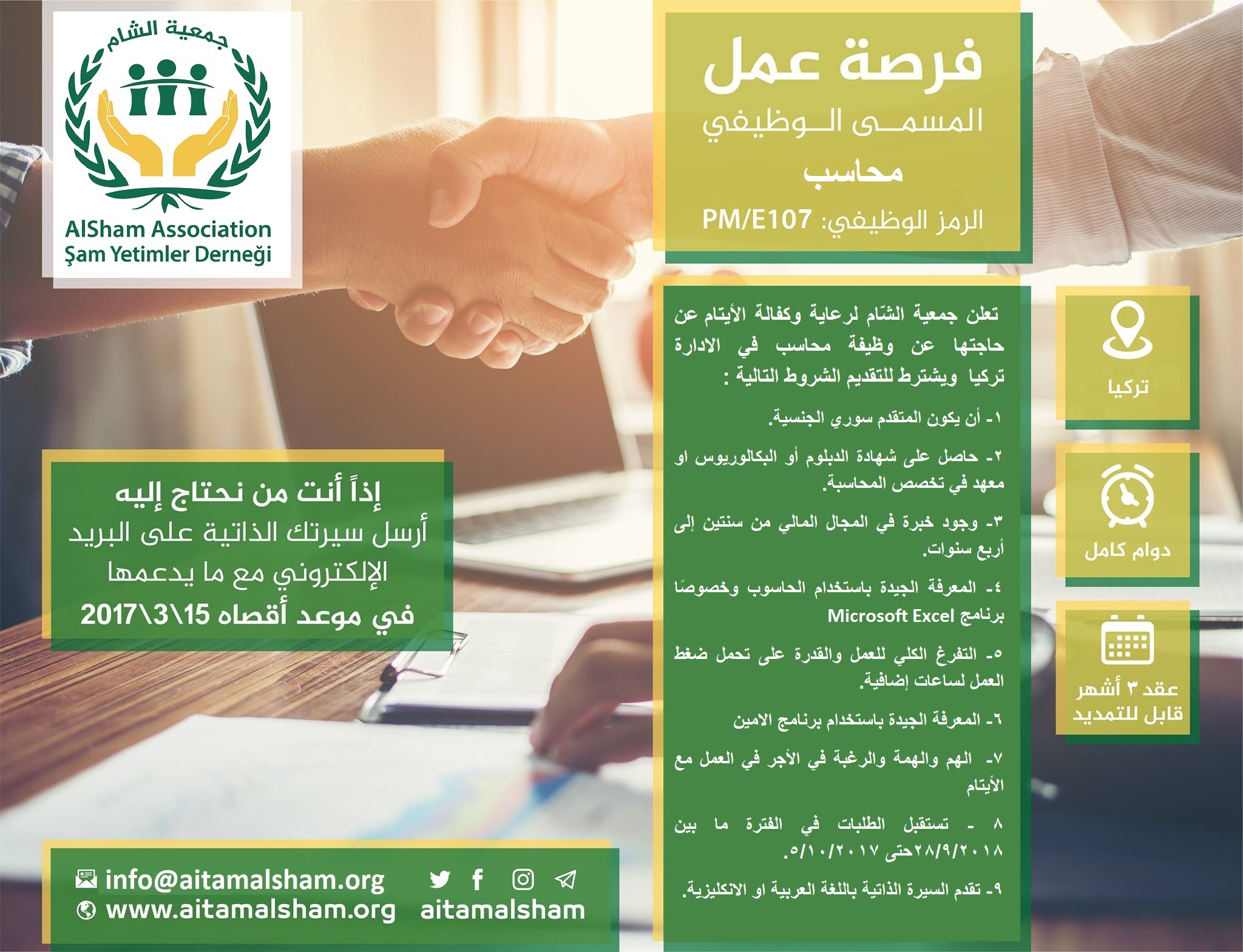 تعلن جمعية الشّام لرعاية وكفالة الأيتام عن حاجتها عن وظيفة محاسب في الادارة تركيا ويشترط للتقديم المواصفات والشروط التالية :