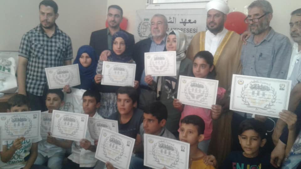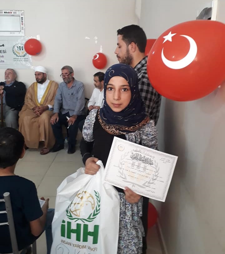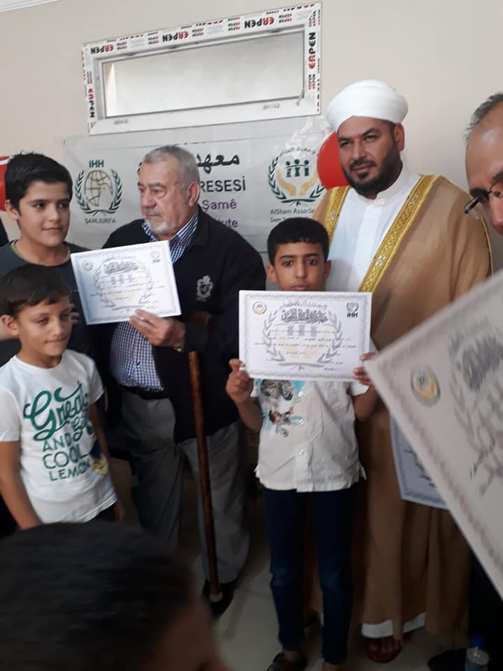 انتهاء النادي الصيفي بمعهد الشام الكائن بدار الابداع التابعة لجمعية الشام باورفا وتكريم الحافظين بحضور الشيخ عيسى بني وقد قام الاخوة في هيئة الاغاثة الانسانية IHH بتقديم هدايا للفائزين