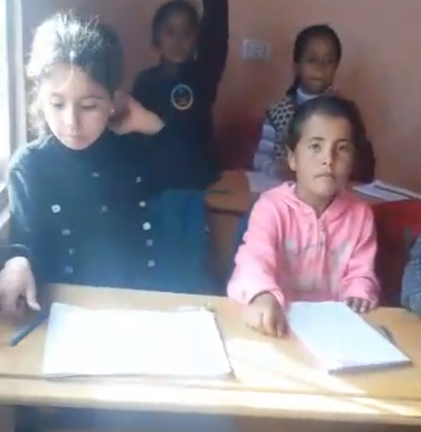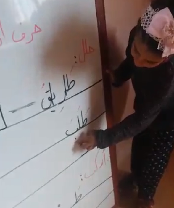 طلاب الصف الاول الابتدائي في مدرسة الشام بقرية الأيتام بسرمدا يتعلمون اليوم حرف الطاء