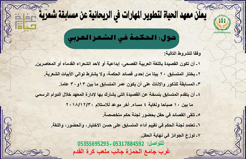 يعلن معهد الحياة لتطوير المهارات في الريحانية عن مسابقة الشعرية ، حول: الحكمة في الشعر العربي