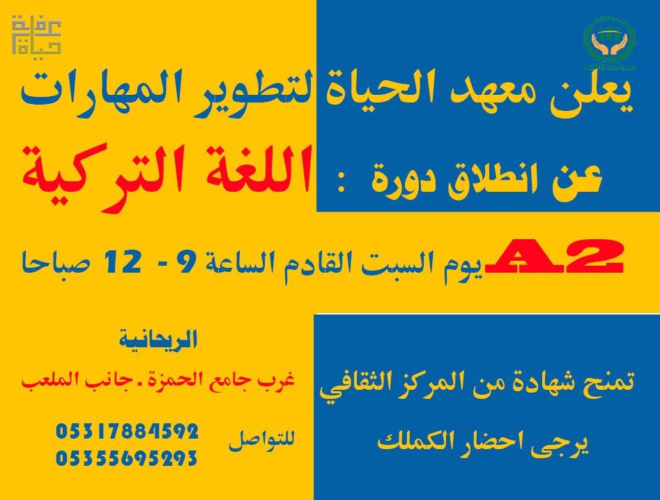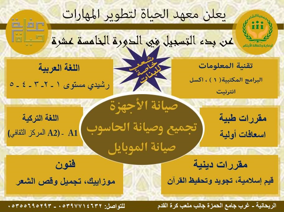 يعلن معهد الحياة التابع لجميعة الشام في الريحانية عن بدء التسجيل في الدورة رقم 15 ومرفق برنامج الدورات