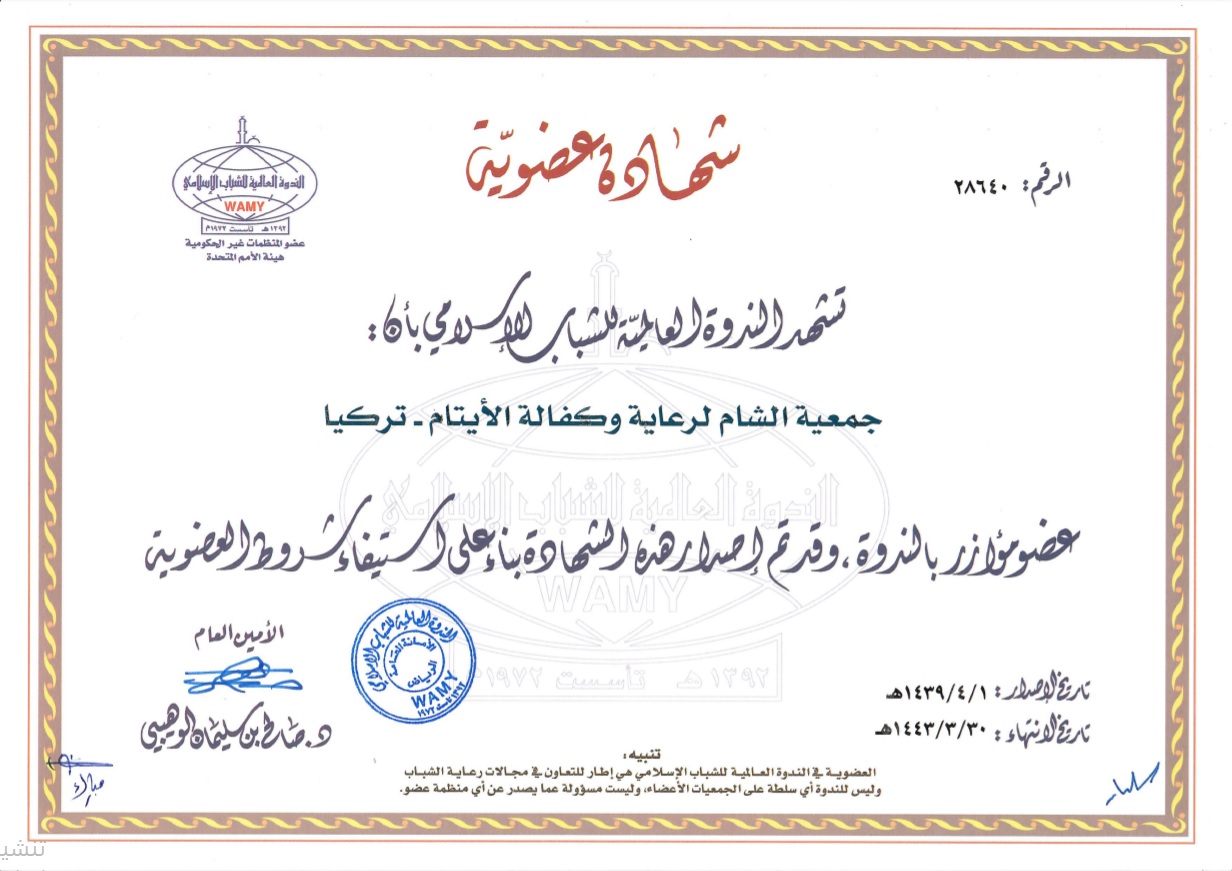 شهادة عضوية بالندوة العالمية بتاريخ 1/4/1439