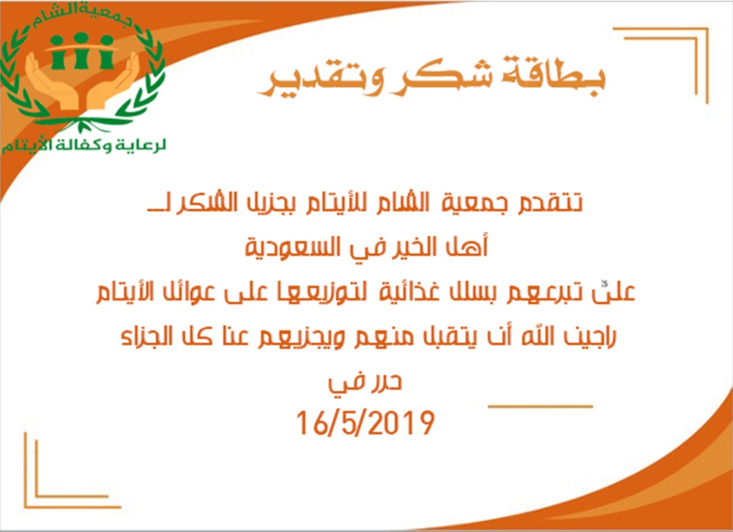الشكر الجزيل لأهل الخير في المملكة العربية السعودية على ما قدموه من دعم للأيتام في شهر رمضان المبارك جزاهم الله عنا وعن أيتامنا خير الجزاء